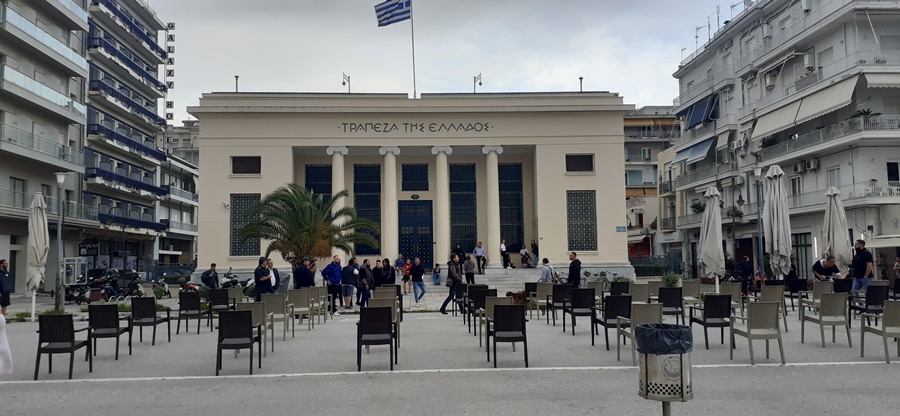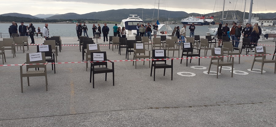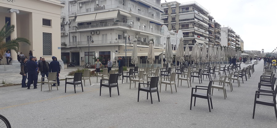 Οι καταστηματάρχες εστίασης τοποθέτησαν καρέκλες των καταστημάτων τους σε απόσταση, όπως επιτάσσουν πλέον οι υγειονομικές συνθήκες θέλοντας με αυτή τους τη δράση να ζητήσουν την έμπρακτη στήριξη του χώρου, που αποτελεί βασικό αιμοδότη της ελληνικής και της τοπικής οικονομίας.