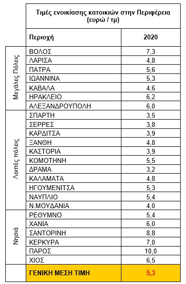 Στις μεγάλες πόλεις της επικράτειας όπως είναι ο Βόλος, η Λάρισα, η Πάτρα, τα Ιωάννινα, η Καβάλα, η Ξάνθη, η Κομοτηνή και το Ηράκλειο, οι ενοικιαστές προτιμούν διαμερίσματα 1 υπνοδωματίου, 40-50 τ.μ., ηλικίας έως 20 ετών, με τις τιμές να διαμορφώνονται από 200 έως 350 ευρώ, αλλά και 2 υπνοδωματίων, 70-90 τ.μ., έως 20 ετών ή παλιότερα (ανακαινισμένα), σε τιμές από 300 μέχρι 450 ευρώ. Στην Καστοριά, την Καρδίτσα, τις Σέρρες, την Ηγουμενίτσα και τη Σπάρτη προτιμούνται για ενοικίαση διαμερίσματα κυρίως 2 υπνοδωματίων, εμβαδού από 70 έως 100 τ.μ., ηλικίας έως 20 ετών και ύψος ενοικίου 300-350 ευρώ”.