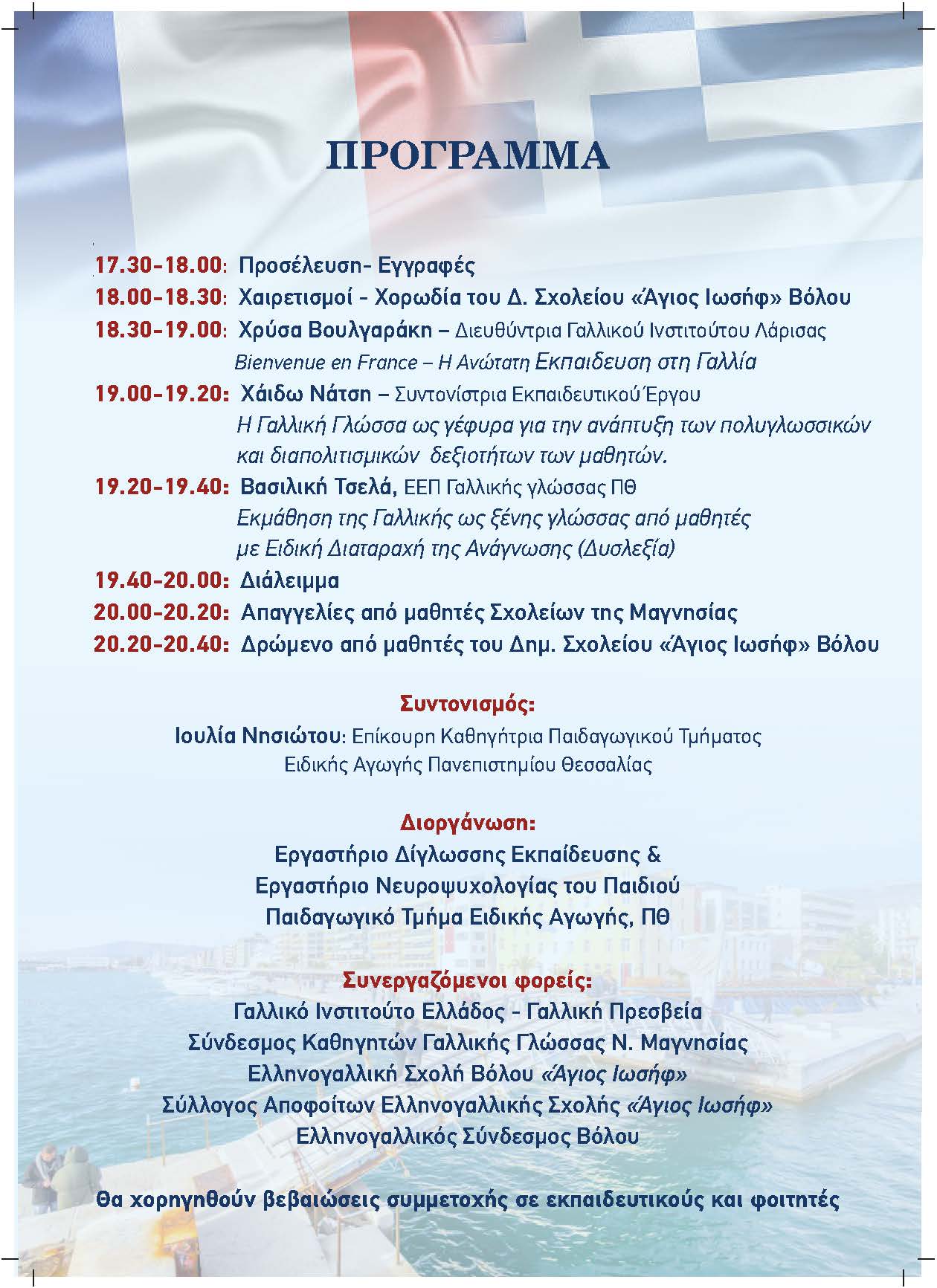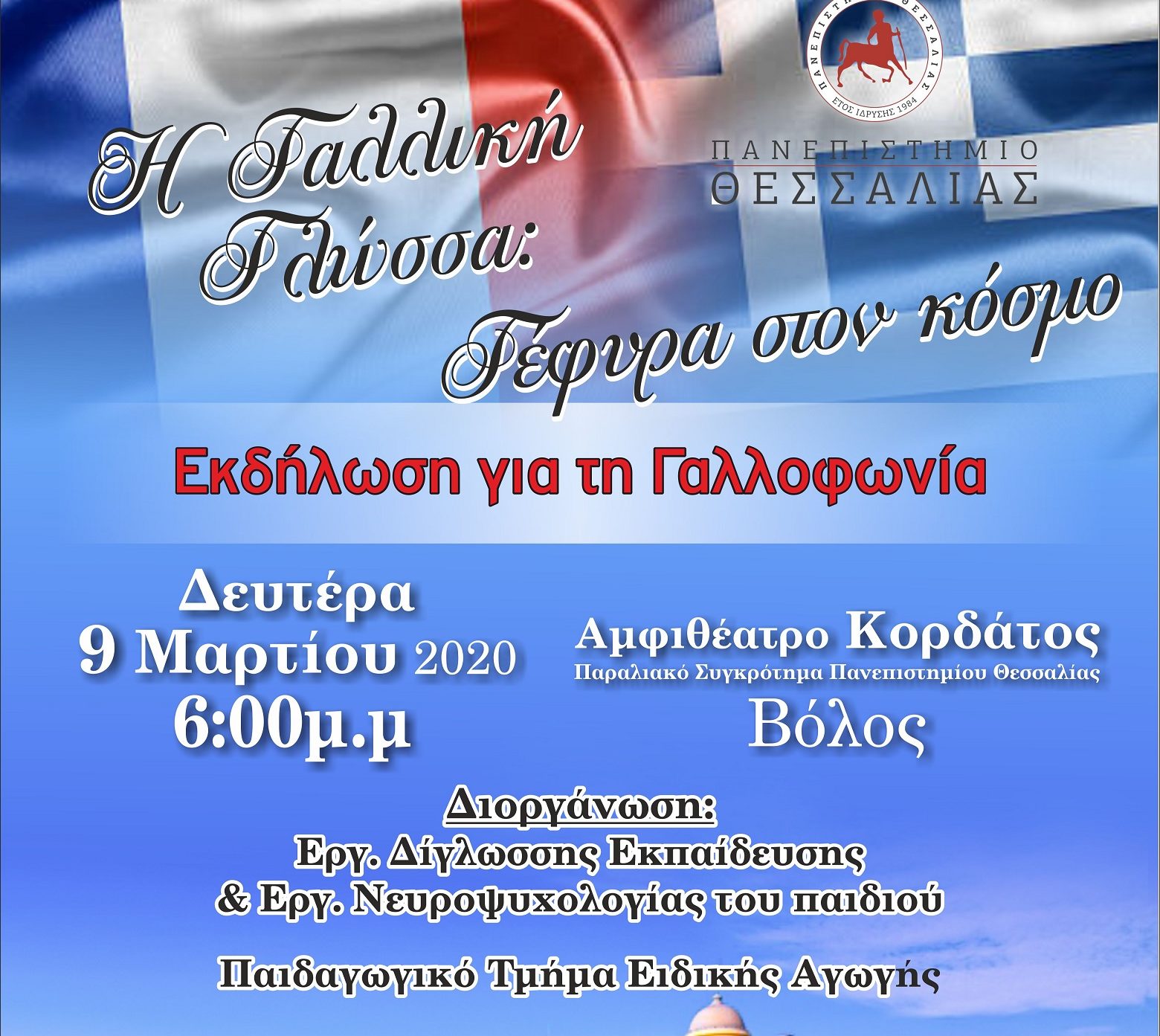 Tο Εργαστήριο Δίγλωσσης Εκπαίδευσης και το Εργαστήριο Νευροψυχολογίας του Παιδιού του ΠΤΕΑ διοργανώνουν τη Δευτέρα 9 Μαρτίου στο αμφιθέατρο Κορδάτος εκδήλωση για τη Γαλλοφωνία με τίτλο «Η Γαλλική Γλώσσα: Γέφυρα στον κόσμο». Στην εκδήλωση θα πραγματοποιηθεί από εκπρόσωπο του Γαλλικού Ινστιτούτου Αθηνών ομιλία με θέμα «Οι μεταπτυχιακές σπουδές στη Γαλλία».