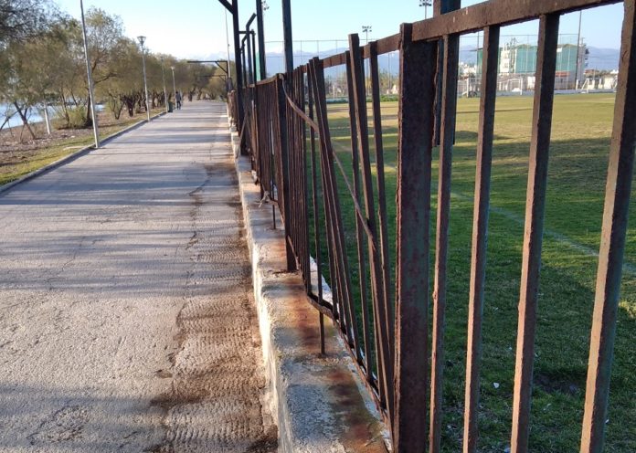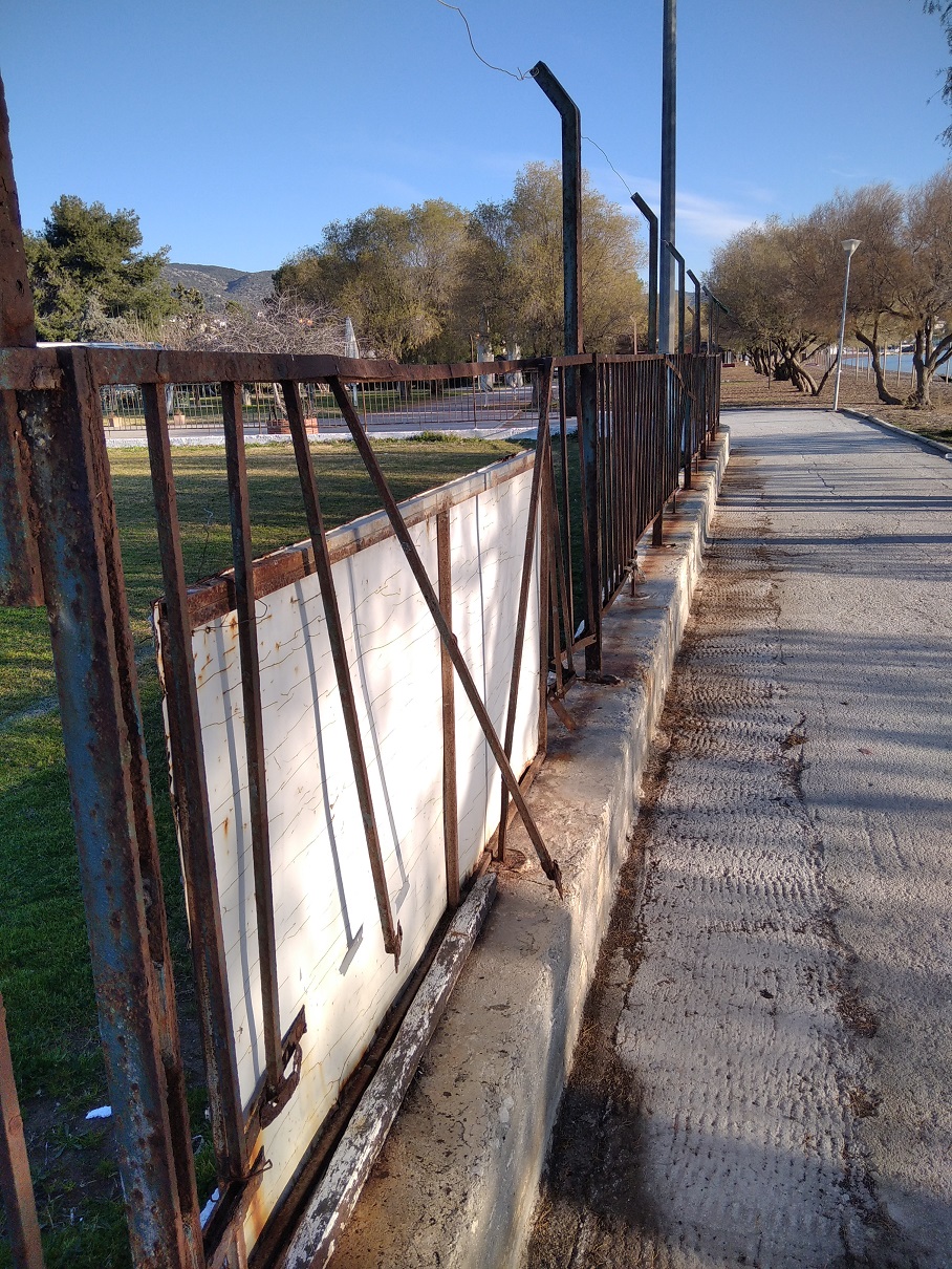 Συγκεκριμένα τα μεταλλικά κιγκλιδώματα της περίφραξης δεν προσφέρουν πλέον καμία ασφάλεια, αφού έχουν διαβρωθεί, είναι σπασμένα και στρεβλωμένα, σε πολλά σημεία έχουν πλήρως αποκολληθεί και το κυριότερο, εκτείνονται επικίνδυνα εντός και εκτός του γηπέδου, με όλους τους εγκυμονούντες κινδύνους που μπορεί να προκληθούν.