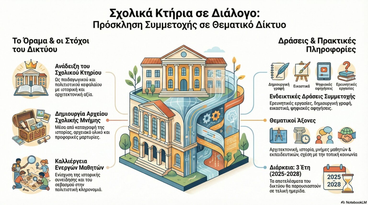 Η διάρκεια του Δικτύου είναι τριετής (2025-2028) και η συμμετοχή των σχολικών μονάδων είναι τριετής. Τα παραγόμενα θα παρουσιαστούν σε ημερίδα που θα διεξαχθεί μετά το πέρας των αποτελεσμάτων.