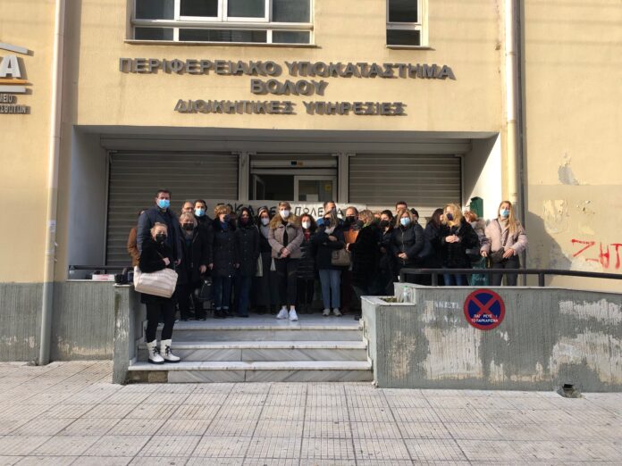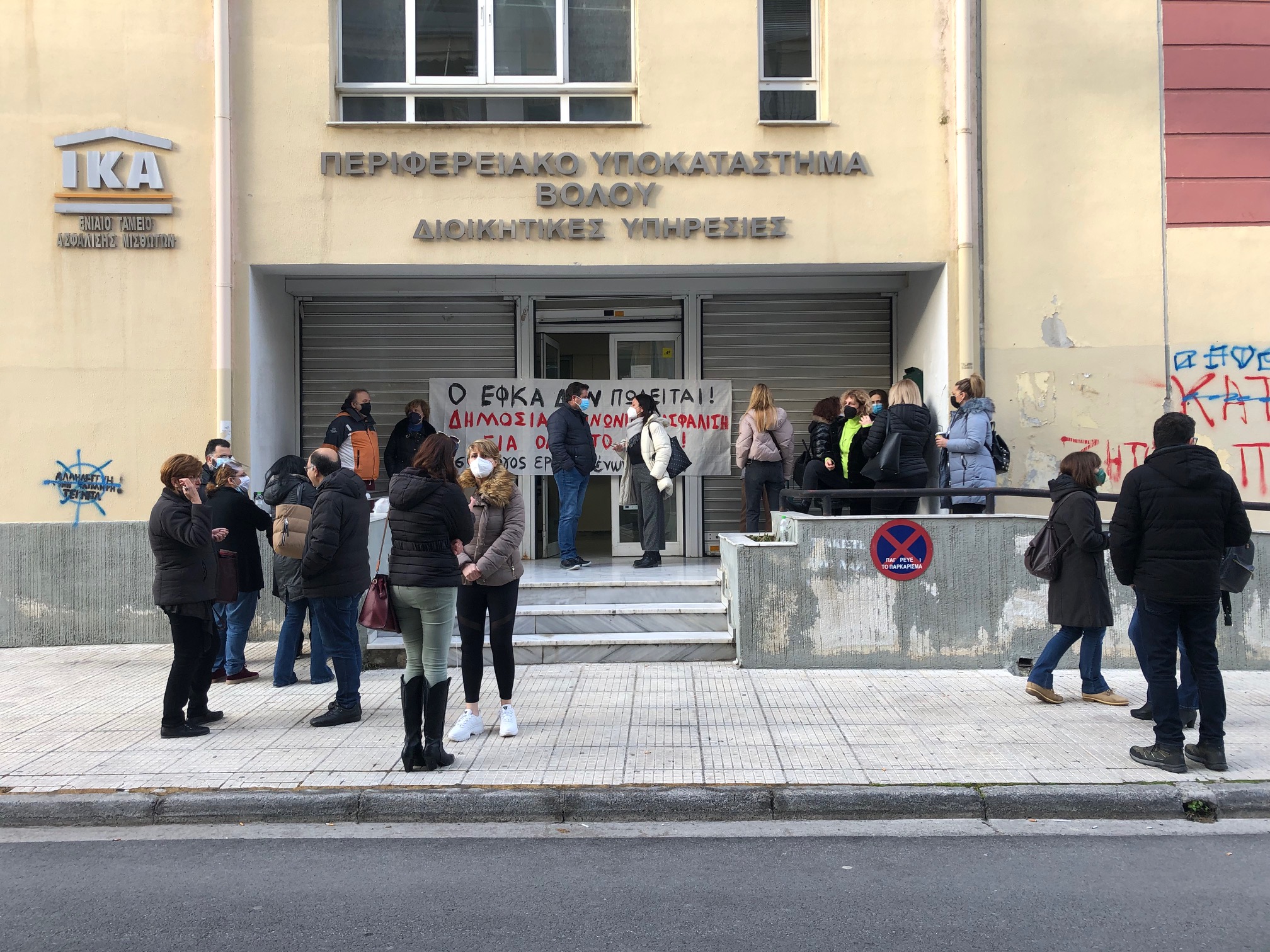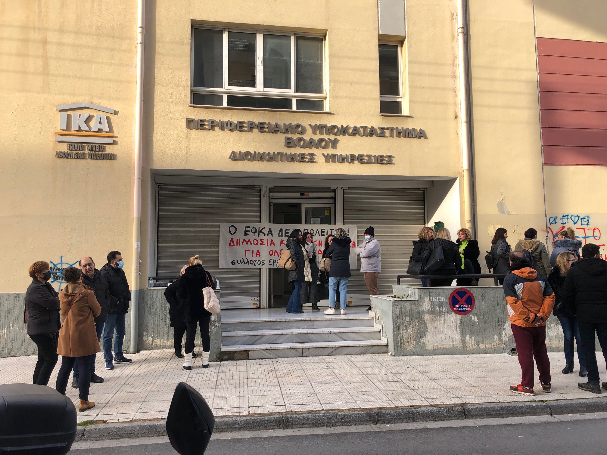 Όχι λένε οι εργαζόμενοι του ΕΦΚΑ και στον Νομό Μαγνησίας σχετικά με το υπό ψήφιση Νομοσχέδιο του Υπουργείου Εργασίας και Κοινωνικών Υποθέσεων, πραγματοποιώντας πανελλαδική 24ωρη στάση εργασίας σήμερα, ύστερα από απόφαση της Πανελλήνιας Ομοσπονδίας Εργαζομένων. Λίγο πριν τις 8.30 το πρωί εργαζόμενοι του Φορέα Κοινωνικής Ασφάλισης Βόλου συσπειρώθηκαν έξω από το παλιό στην οδό Θρακών κτίριο για να διαμαρτυρηθούν απέναντι σε ένα νομοσχέδιο που, όπως τόνισαν, «ξεπουλάει τη δημόσια περιουσία».
