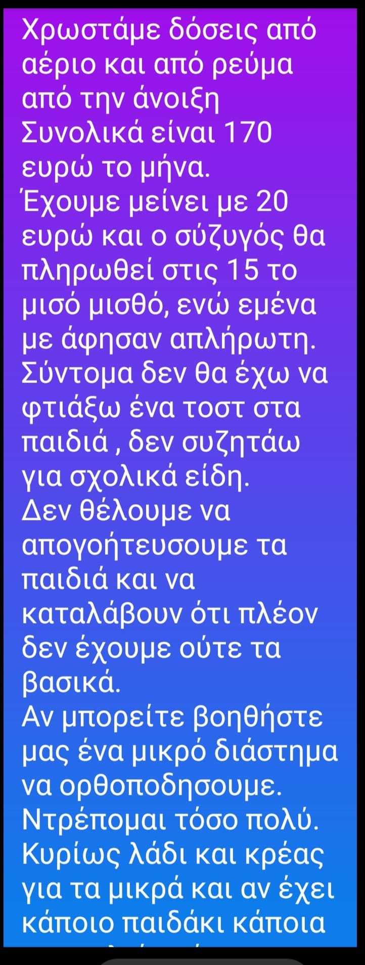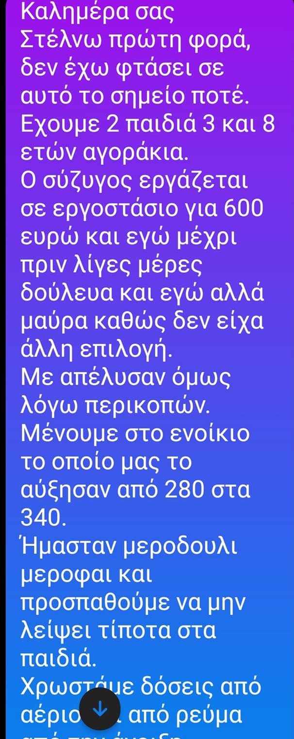 «Στέλνω πρώτη φορά, δεν έχω φτάσει σε αυτό το σημείο ποτέ. Έχουμε δύο παιδιά 3 και 8 ετών αγοράκια. Ο σύζυγος εργάζεται σε εργοστάσιο για 600 ευρώ και εγώ μέχρι πριν λίγες μέρες δούλευα αλλά μαύρα, καθώς δεν είχα άλλη επιλογή. Με απέλυσαν όμως λόγω περικοπών. Μένουμε στο ενοίκιο, το οποίο μας το αύξησαν από 280 στα 340 ευρώ. Ήμασταν μεροδούλι, μεροφάι και προσπαθούμε να μην λείψει τίποτα στα παιδιά. Χρωστάμε δόσεις από αέριο και από ρεύμα από την άνοιξη. Συνολικά είναι 170 ευρώ το μήνα. Έχουμε μείνει με 20 ευρώ κα ο σύζυγος θα πληρωθεί στις 15 το μισό μισθό, ενώ εμένα με άφησαν απλήρωτη. Σύντομα δεν θα έχω να φτιάξω ένα τοστ στα παιδιά, δεν συζητάω για σχολικά είδη. Δεν θέλουμε να απογοητεύσουμε τα παιδιά και να καταλάβουν ότι πλέον δεν έχουμε ούτε τα βασικά.