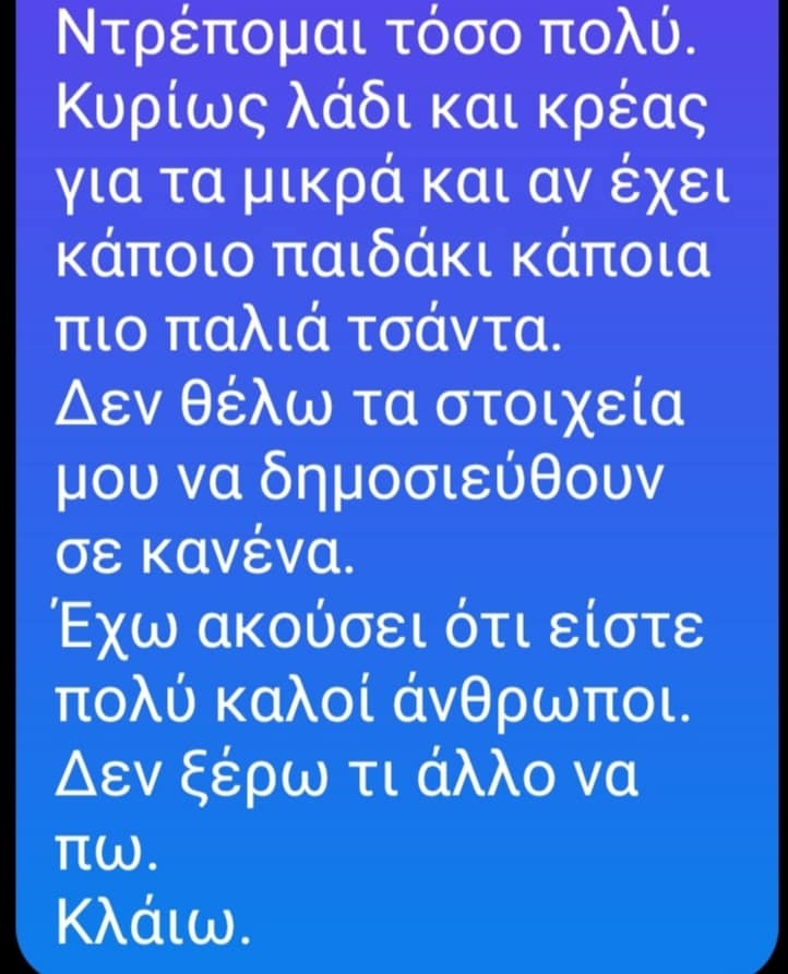 Αν μπορείτε βοηθήστε μας ένα μικρό διάστημα να ορθοποδήσουμε. Ντρέπομαι τόσο πολύ. Κυρίως λάδι και κρέας για τα μικρά και αν έχει κάποιο παιδάκι κάποια πιο παλιά τσάντα. Έχω ακούσει ότι είστε πολύ καλοί άνθρωποι. Δεν ξέρω τι άλλο να πω. Κλαίω», έγραψε χαρακτηριστικά στην Ομάδα, με τους ανθρώπους της να έρχονται για ακόμη μία φορά αντιμέτωποι με μια πολύ δύσκολη οικογενειακή κατάσταση.