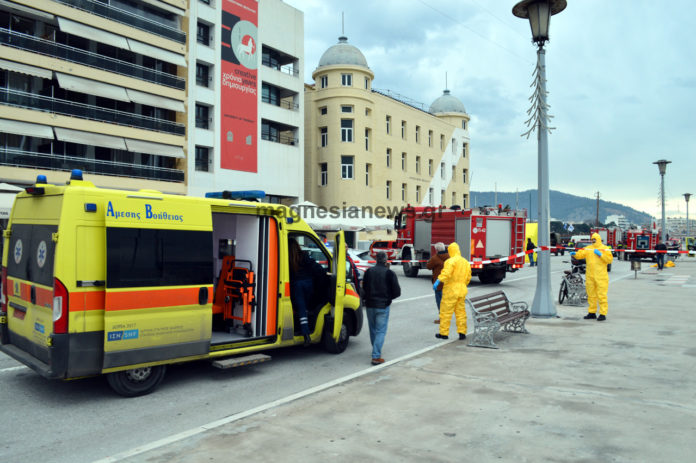 Από χθες το μεσημέρι στήθηκε μεγάλη επιχείρηση ειδικής ομάδας της ΕΜΑΚ, του ΕΚΑΒ, της Αστυνομίας και του Λιμεναρχείου, ο χώρος αποκλείστηκε και εφαρμόστηκε το Σχέδιο Αντιμετώπισης Χημικών Βιολογικών Απειλών, που ισχύει γι’ αυτές τις περιπτώσεις.