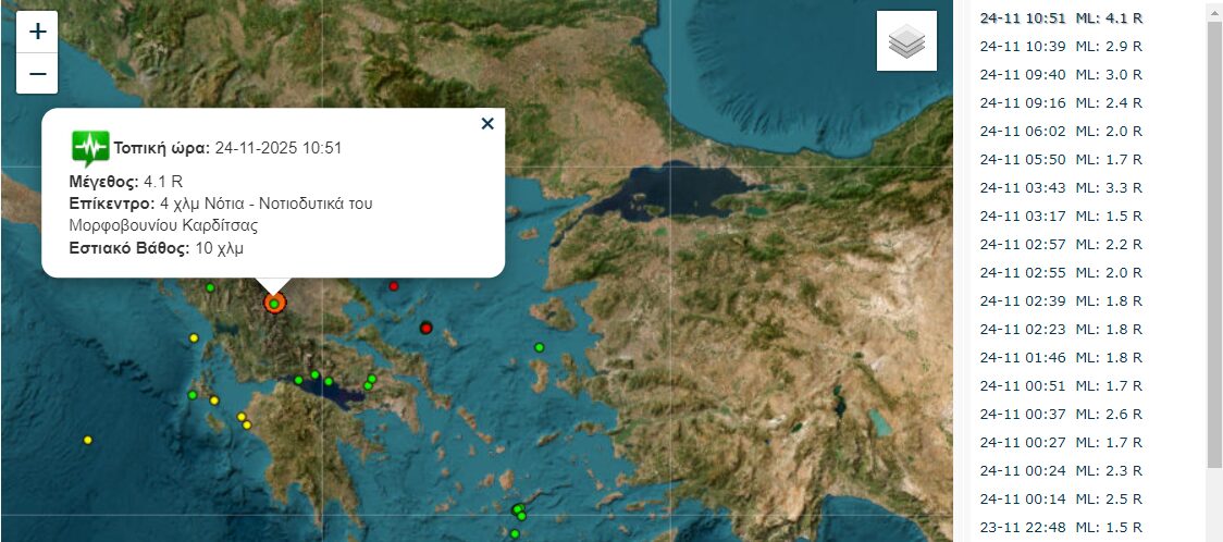 Σεισμός μεγέθους 4.1 Ρίχτερ καταγράφηκε σήμερα στις 10:51 και έγινε ιδιαίτερα αισθητός και στον Βόλο. Το επίκεντρο του σεισμού εντοπίζεται 4 χλμ Νότια – Νοτιοδυτικά του Μορφοβουνίου Καρδίτσας, ενώ το εστιακό του βάθος είναι στα 10 χλμ.