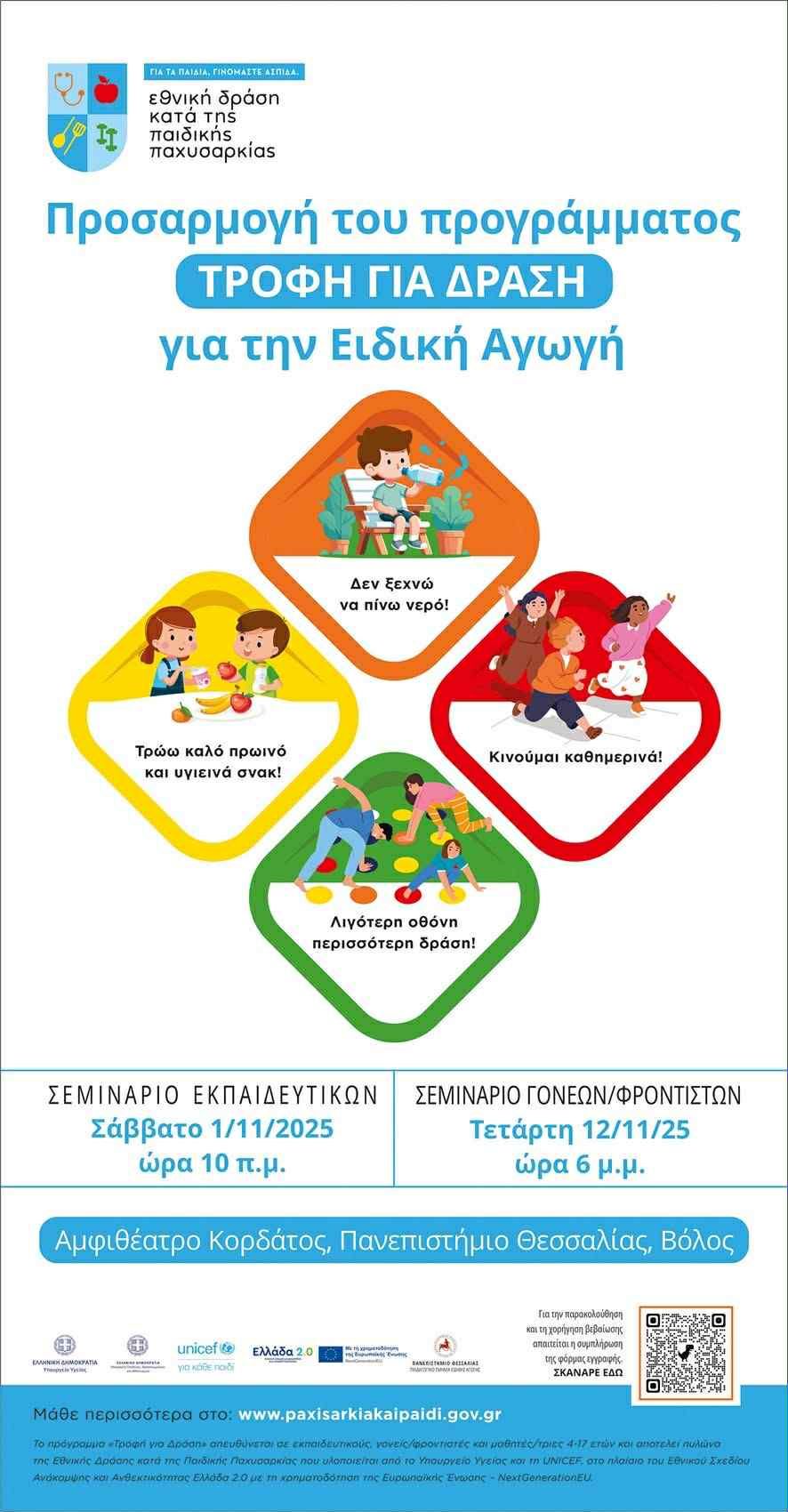 Σεμινάριο με θέμα: «Προσαρμογή του Προγράμματος Τροφή για Δράση για την Ειδική Αγωγή», θα πραγματοποιηθεί το Σάββατο 1η Νοεμβρίου 2025, στις 10 π.μ., στο Αμφιθέατρο Κορδάτος του παραλιακού συγκροτήματος του Πανεπιστημίου Θεσσαλίας, στον Βόλο. Το σεμινάριο διοργανώνεται από τη Unicef Ελλάδας και το Εργαστήριο Εκπαιδευτικής Νευροεπιστήμης και Αναπτυξιακών Διαταραχών του Παιδαγωγικού Τμήματος Ειδικής Αγωγής.