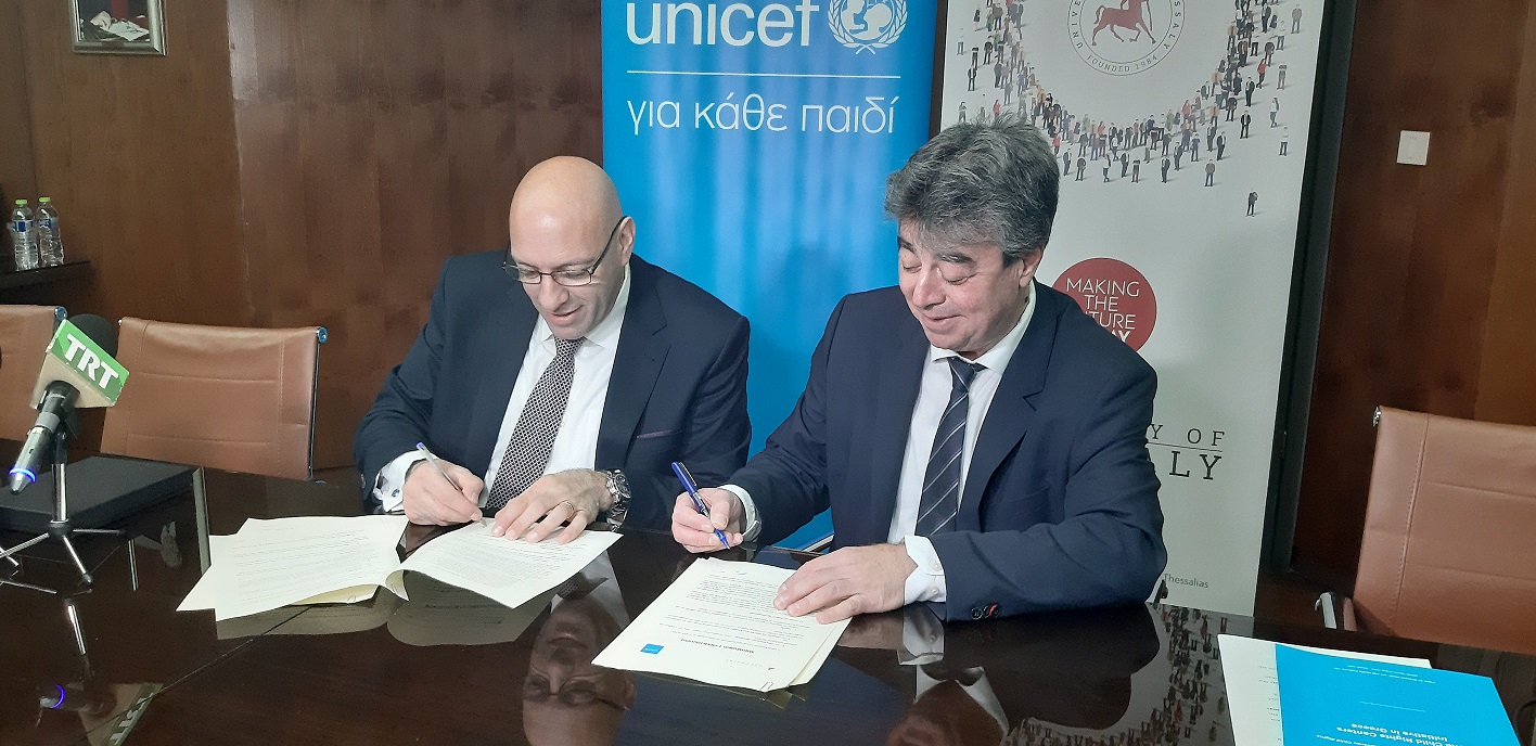 Μια διαφορετική, ξεχωριστή και άκρως ανθρωποκεντρική συνεργασία σφραγίστηκε σήμερα, μεταξύ του Πανεπιστημίου Θεσσαλίας και της Unicef, με στόχο την ίδρυση Κέντρου για τα Δικαιώματα του Παιδιού. Το μνημόνιο συνεργασίας υπογράφηκε σήμερα μεταξύ του Πρύτανης του Ιδρύματος κ. Χαρ. Μπιλλίνη και του διπλωματικού εκπροσώπου της Unicef στην Ελλάδα Hasan Halil.