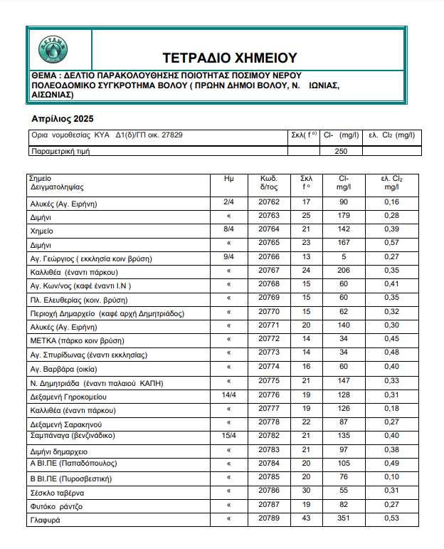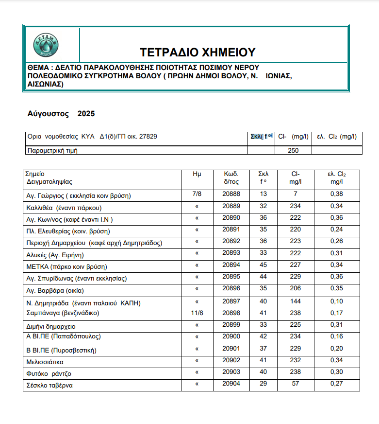 Έτσι λοιπόν στην Καλλιθέα τα χλωριόντα είναι στα 234mg/l, στον Άγιο Κωνσταντίνο στα 22, στην Πλατεία Ελευθερίας στα 220, στην περιοχή του Δημαρχείου στα 223, στη ΜΕΤΚ στα 227, στον Άγιο Σπυρίδωνα στα 229, στην Αγ. Βαρβάρα στα 206, στη Ν. Δημητριάδα στα 144, στον Σαμπάναγα 238, στο Διμήνι στα 225, στην Α ΒΙΠΕ στα 234, στη Β ΒΙΠΕ στα 229, στα Μελισσιάτικα 232 και στο Φυτόκο στα 238mg/l.