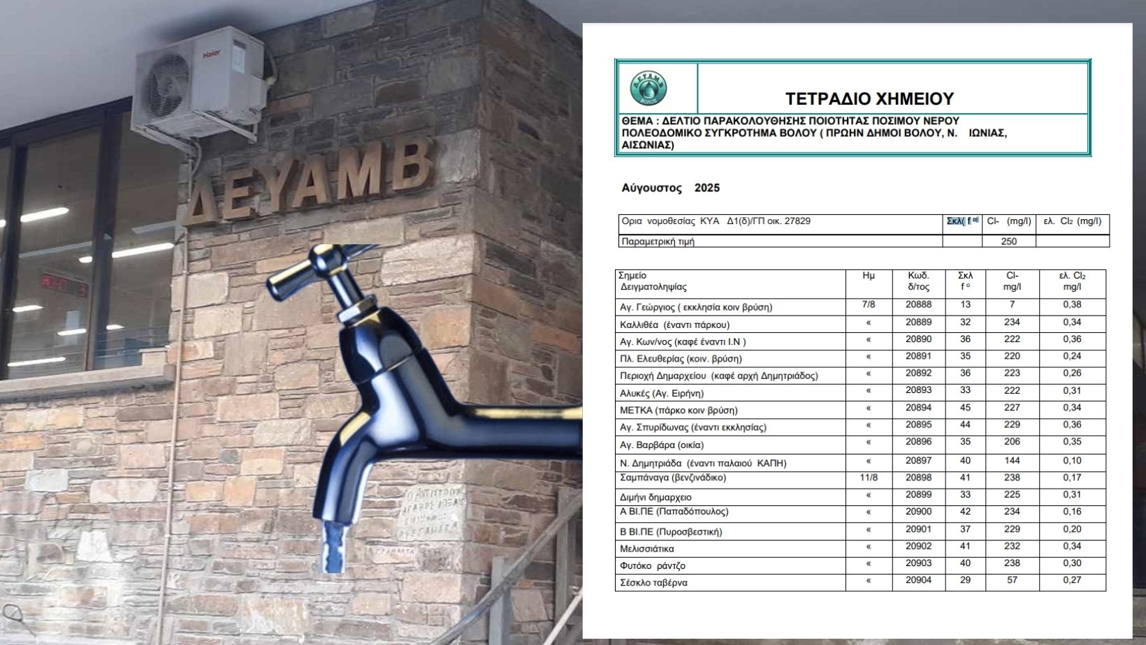 Σκληρό και γεμάτο χλώριο είναι το νερό σε πολλές περιοχές του Βόλου, από τις Αλυκές, τον Άγιο Κωνσταντίνο, τη Ν. Ιωνία και τη Ν. Δημητριάδα ως και το Διμήνι, σύμφωνα με τις μετρήσεις της ΔΕΥΑΜΒ για τον Αύγουστο.