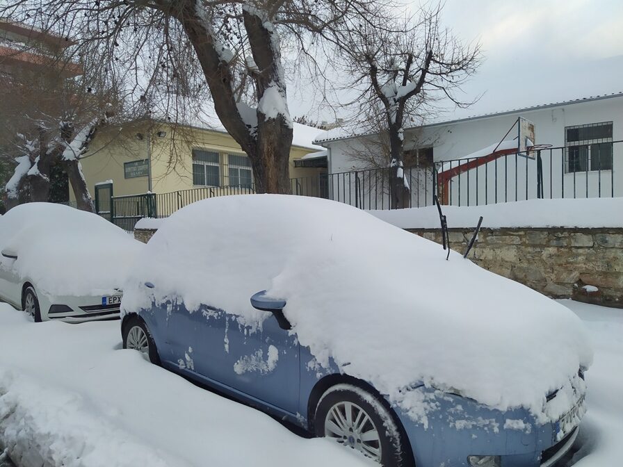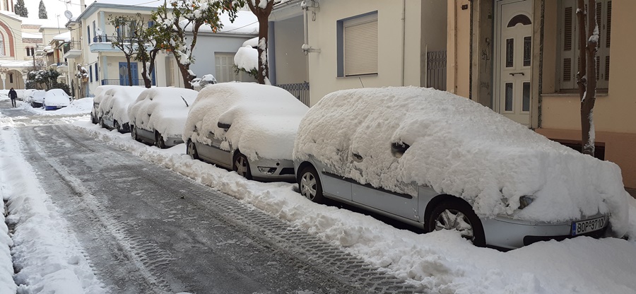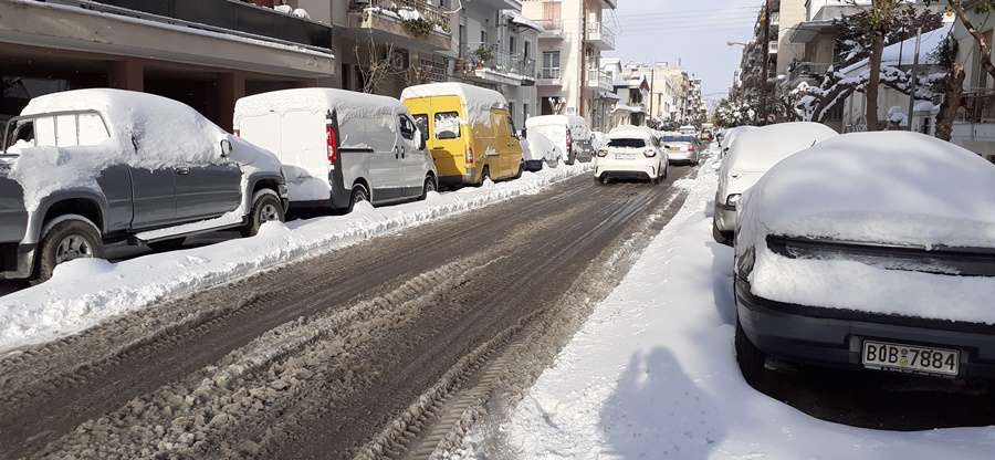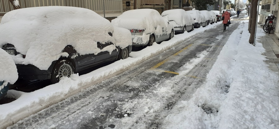 Η κυκλοφορία γίνεται κανονικά, με μεγάλη όμως προσοχή από τους οδηγούς. Τα σταθμευμένα αυτοκίνητα έχουν σκεπαστεί από χιόνι, το οποίο ξεπερνά τους 20 πόντους