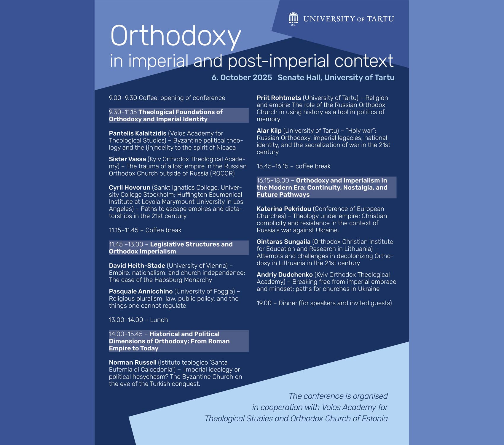 Το διεθνές Συνέδριο «Η Ορθοδοξία στην Εποχή των Αυτοκρατοριών και μετέπειτα» πραγματοποιείται σήμερα, Δευτέρα 6 Οκτωβρίου 2025, στην Αίθουσα της Γερουσίας του Πανεπιστημίου του Τάρτου, στην Εσθονία. Το Συνέδριο συνδιοργανώνεται από το Πανεπιστήμιο του Τάρτου, την Ακαδημία Θεολογικών Σπουδών Βόλου και την Ορθόδοξη Εκκλησία της Εσθονίας. Η Ακαδημία Θεολογικών Σπουδών εκπροσωπείται από τον Διευθυντή της, Παντελή Καλαϊτζίδη, ο οποίος παρουσιάζει το θέμα «Βυζαντινή πολιτική θεολογία και η (α)συνέπεια με το πνεύμα της Νίκαιας».