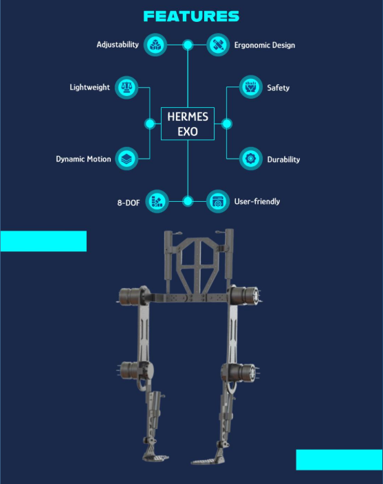 Ο κύριος στόχος του HERMES EXO είναι να βοηθήσει άτομα με παραπληγία να σταθούν όρθιοι, να περπατήσουν σε ομαλό ή ανώμαλο έδαφος, να ανέβουν/κατέβουν σκάλες και, γενικότερα, να τους βοηθήσει στις καθημερινές διαδικασίες. Διαθέτει εργονομικό και ευέλικτο σχεδιασμό, δηλαδή επιτρέπει την προσαρμογή του σύμφωνα με τις προδιαγραφές του χρήστη (ύψος και βάρος), είναι εύκολος στην τοποθέτηση, ελαφρύς, ανθεκτικός, εύχρηστος και προσφέρει άνετη εφαρμογή. Αυτή η υποστηρικτική συσκευή είναι ειδικά σχεδιασμένη ως ερευνητικό πρωτότυπο για συμμετοχή στην κατηγορία Exoskeleton Race του διαγωνισμού CYBATHLON 2024. Οι προδιαγραφές και οι δυνατότητες του εξωσκελετού είναι σύμφωνες με τις απαιτήσεις και τους στόχους του διαγωνισμού. Η ομάδα επιβλέπει πλήρως την υλοποίηση, κατασκευή και λειτουργία, συνεργαζόμενη με πιστοποιημένους συνεργάτες για ορισμένες εφαρμογές. Ο HERMES EXO διαθέτει και ενσωματώνει πιστοποιημένα εξαρτήματα για την προοριζόμενη εφαρμογή της.