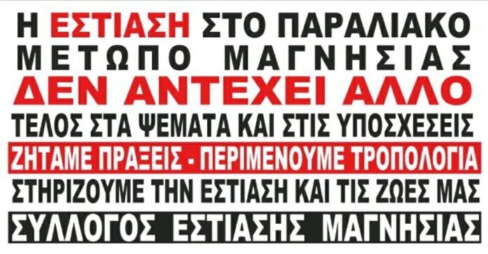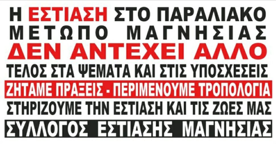 Συγκέντρωση αύριο Τρίτη 9 Δεκεμβρίου στις 12 θα πραγματοποιήσουν επαγγελματίες της εστίασης από το παραλιακό μέτωπο του Παγασητικού έξω από το πρώην δημαρχείο Νέας Αγχιάλου και στη συνέχεια θα κατευθυνθούν προς το μπλόκο στις Μικροθήβες.