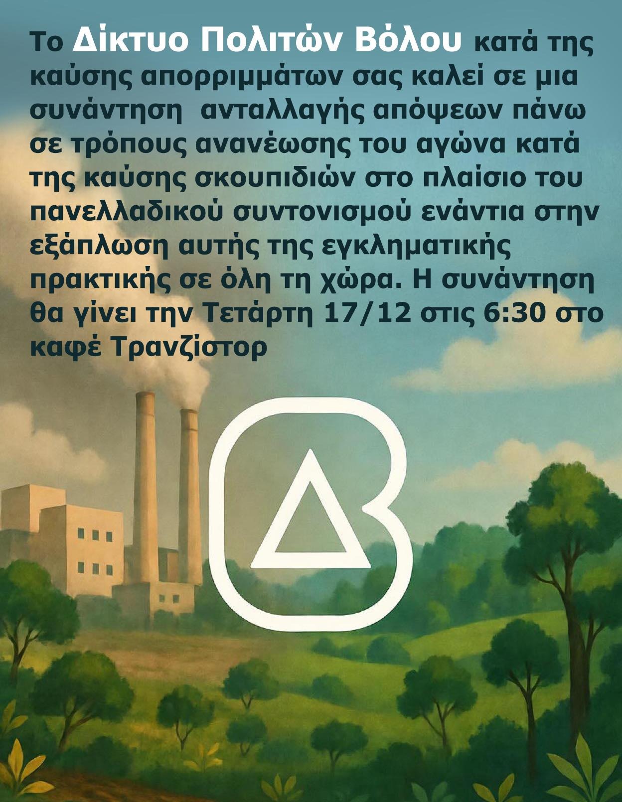 Το Δίκτυο Πολιτών Βόλου κατά της καύσης απορριμμάτων καλεί τους Βολιώτες και τις Βολιώτισσες σε μια συνάντηση ανταλλαγής απόψεων πάνω σε τρόπους ανανέωσης του αγώνα κατά της καύσης σκουπιδιών στο πλαίσιο του πανελλαδικού συντονισμού ενάντια στην εξάπλωση αυτής της εγκληματικής, όπως τη χαρακτηρίζει, πρακτικής σε όλη τη χώρα.