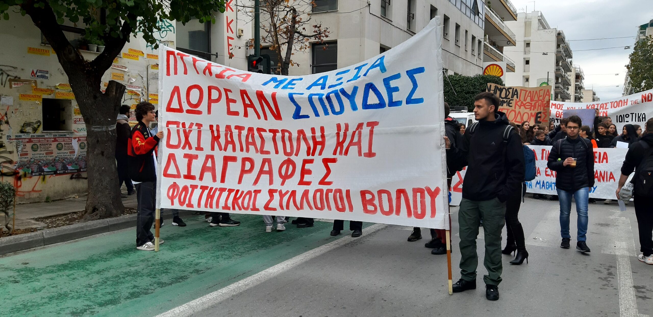 Στον δρόμο βγήκαν σήμερα μαθητές σχολείων του Βόλου και φοιτητές των τμημάτων του Πανεπιστημίου Θεσσαλίας, συμμετέχοντας στον πανελλαδικό πανεκπαιδευτικό συλλαλητήριο διεκδικώντας ουσιαστική δημόσια και δωρεάν παιδεία.
