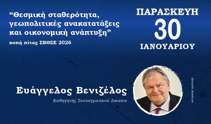 Την ετήσια εκδήλωσή του για την κοπή της πρωτοχρονιάτικης πίτας θα πραγματοποιήσει ο Σύνδεσμος Βιομηχανιών Θεσσαλίας & Στερεάς Ελλάδας την Παρασκευή 30 Ιανουαρίου. Επίτιμος προσκεκλημένος στην εκδήλωση είναι ο πρώην Πρόεδρος του ΠΑΣΟΚ, Καθηγητής Συνταγματικού Δικαίου κ. Ευάγγελος Βενιζέλος, ο οποίος θα μιλήσει στους παρευρισκόμενους με το θέμα της ομιλίας του να είναι «Θεσμική σταθερότητα, γεωπολιτικές ανακατατάξεις και οικονομική ανάπτυξη».