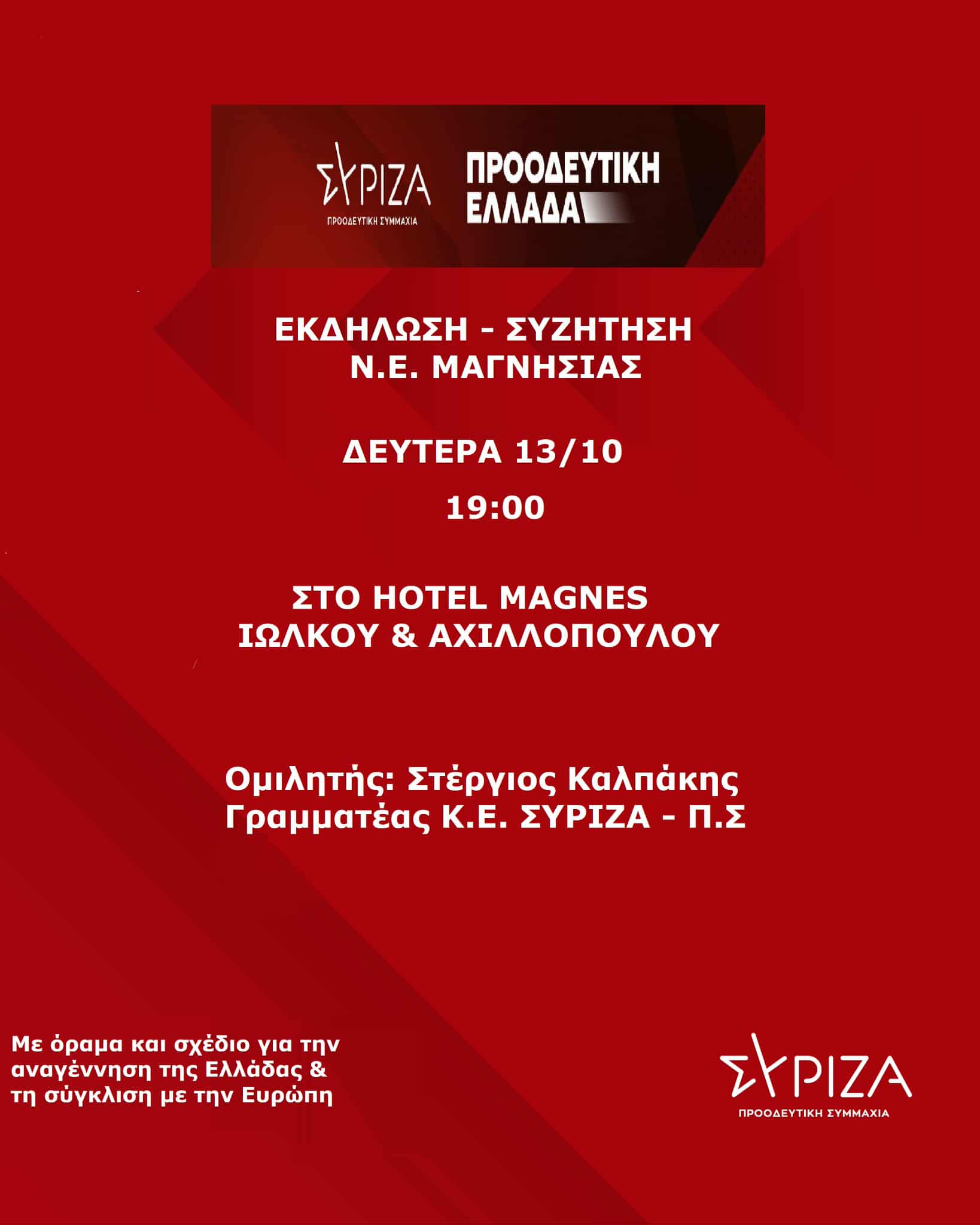 Εκδήλωση πραγματοποιεί η Νομαρχιακή Επιτροπή του ΣΥΡΙΖΑ Μαγνησίας τη Δευτέρα 13 Οκτωβρίου στις 19.00 στον ημιώροφο του ξενοδοχείου MAGNES , με κεντρικό ομιλητή τον γραμματέα του κόμματος, Στέργιο Καλπάκη.