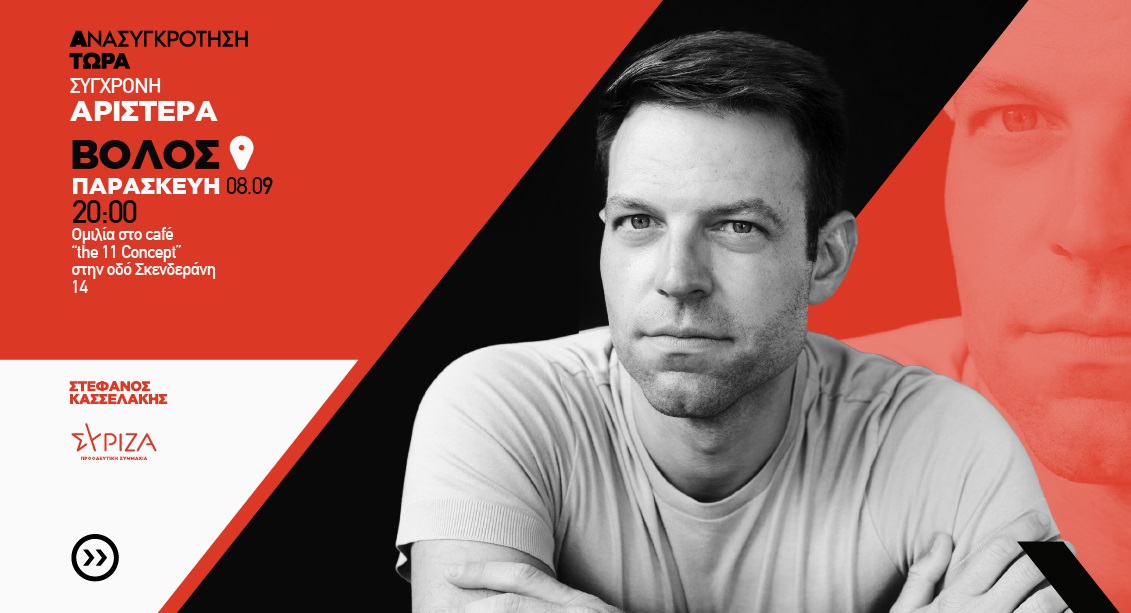 Στο Βόλο θα βρεθεί την Παρασκευή (08/09) ο υποψήφιος για την προεδρία του ΣΥΡΙΖΑ -ΠΣ, Στέφανος Κασσελάκης. Ο Σ. Κασσελάκης θα επιθεωρήσει τις πληγείσες περιοχές μαζί με κλιμάκιο του ΣΥΡΙΖΑ ΠΣ και τον βουλευτή Μαγνησίας Αλέξανδρο Μεϊκόπουλο, ενώ στις 20:00 θα βρεθεί στο καφέ «the 11 Concept”, στην οδό Σκενδεράνη 14, όπου θα έχει μια ανοιχτή συζήτηση με τα μέλη, τους φίλους του ΣΥΡΙΖΑ-Π.Σ. αλλά και κάθε προοδευτικό και δημοκρατικό πολίτη της Μαγνησίας.