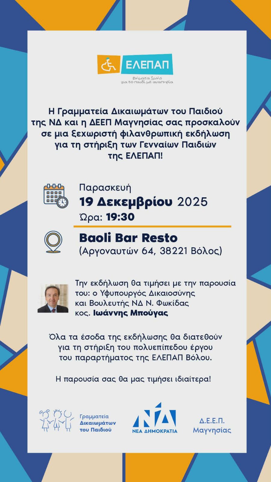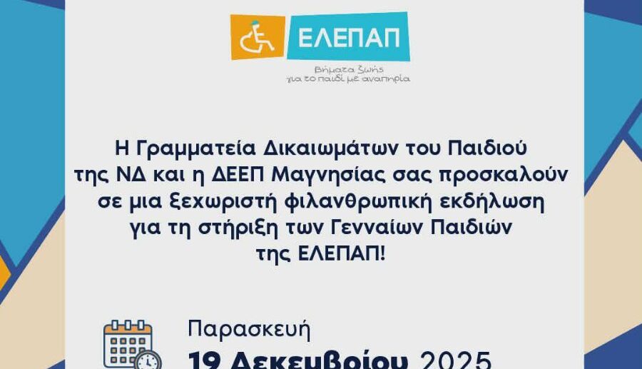 Η ΔΕΕΠ Μαγνησίας της Νέας Δημοκρατίας σε συνεργασία με την Γραμματεία Δικαιωμάτων του Παιδιού του κόμματος για αυτές τις γιορτές στέκεται δίπλα στα γενναία παιδιά της ΕΛΕΠΑΠ και θέλοντας να ενισχύσει την τεράστια και συνεχή προσπάθεια για μία ποιοτικότερη ζωή των παιδιών και των οικογενειών του στηρίζει τον αγώνα των ανθρώπων της ΕΛΕΠΑΠ καλεί όλους να δώσουν το παρών σε εκδήλωση που διοργανώνει στο Βόλο, την Παρασκευή 19 Δεκεμβρίου.