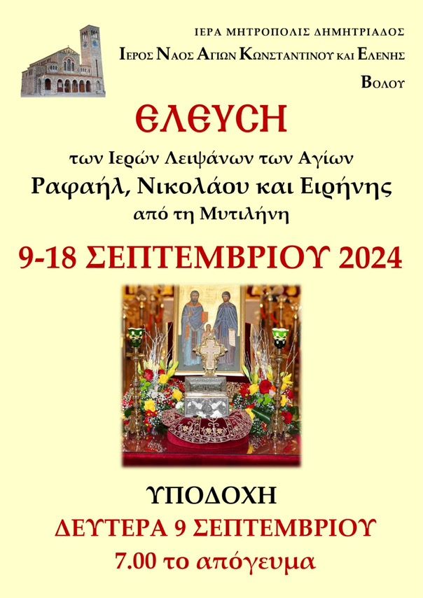 Τα χαριτόβρυτα Ιερά Λείψανα των Αγίων και Θαυματουργών Νεομαρτύρων Ραφαήλ, Νικολάου και Ειρήνης από τη Μυτιλήνη, τα οποία ευλαβείται τα μέγιστα ὁ χριστεπώνυμος λαός της πατρίδας μας, θα έχει την ευλογία να φιλοξενήσει ο Ιερός Ναός των Αγίων Κωνσταντίνου και Ελένης Βόλου, στα πλαίσια του Ετήσιου Εορτασμού της Υψώσεως του Τιμίου Σταυρού, από τις 9 έως και τις 18 Σεπτεμβρίου.