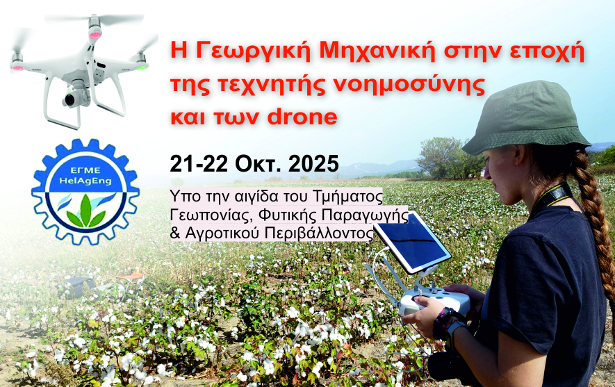 Η Εταιρεία Γεωργικών Μηχανικών Ελλάδας (Ε.Γ.Μ.Ε.) μέλος της EurAgEng (Ευρωπαϊκή Εταιρεία Γεωργικών Μηχανικών) διοργανώνει το 14ο Πανελλήνιο Συνέδριο με θέμα: «Η Γεωργική Μηχανική στην εποχή της τεχνητής νοημοσύνης και των drone», το οποίο θα πραγματοποιηθεί στις 21 & 22 Οκτωβρίου 2025 στο ξενοδοχείο “Valis” στην Αγριά Βόλου, υπό την αιγίδα του Τμήματος Γεωπονίας, Φυτικής Παραγωγής & Αγροτικού Περιβάλλοντος του Πανεπιστημίου Θεσσαλίας.