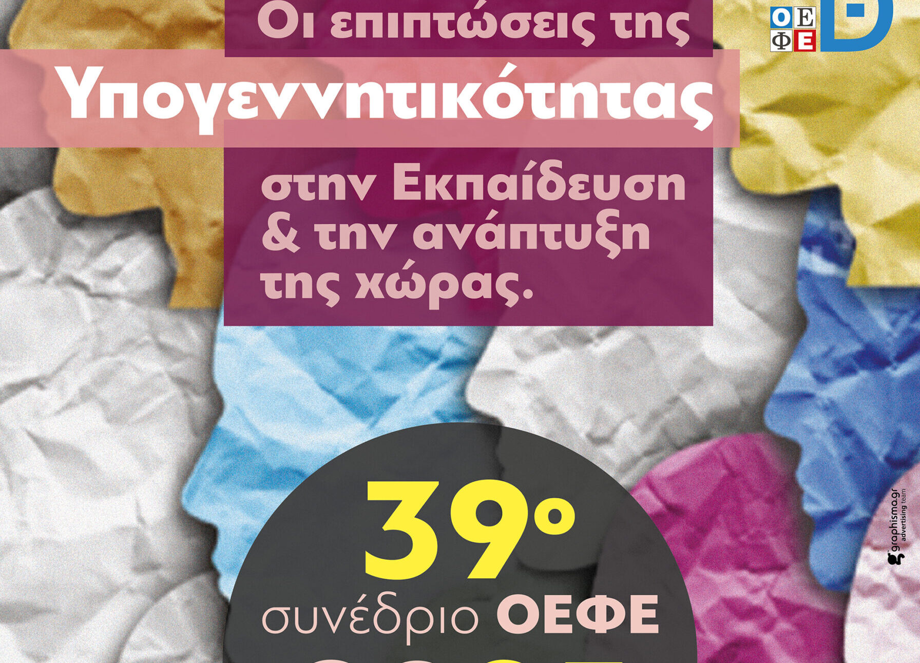 Το 39ο Πανελλήνιο Συνέδριο της Ομοσπονδίας Φροντιστών Εκπαιδευτικών Ελλάδος (ΟΕΦΕ) θα πραγματοποιηθεί το Σάββατο 15 Νοεμβρίου με θέμα «Οι επιπτώσεις της Υπογεννητικότητας στην Εκπαίδευση και στην ανάπτυξη της χώρας».