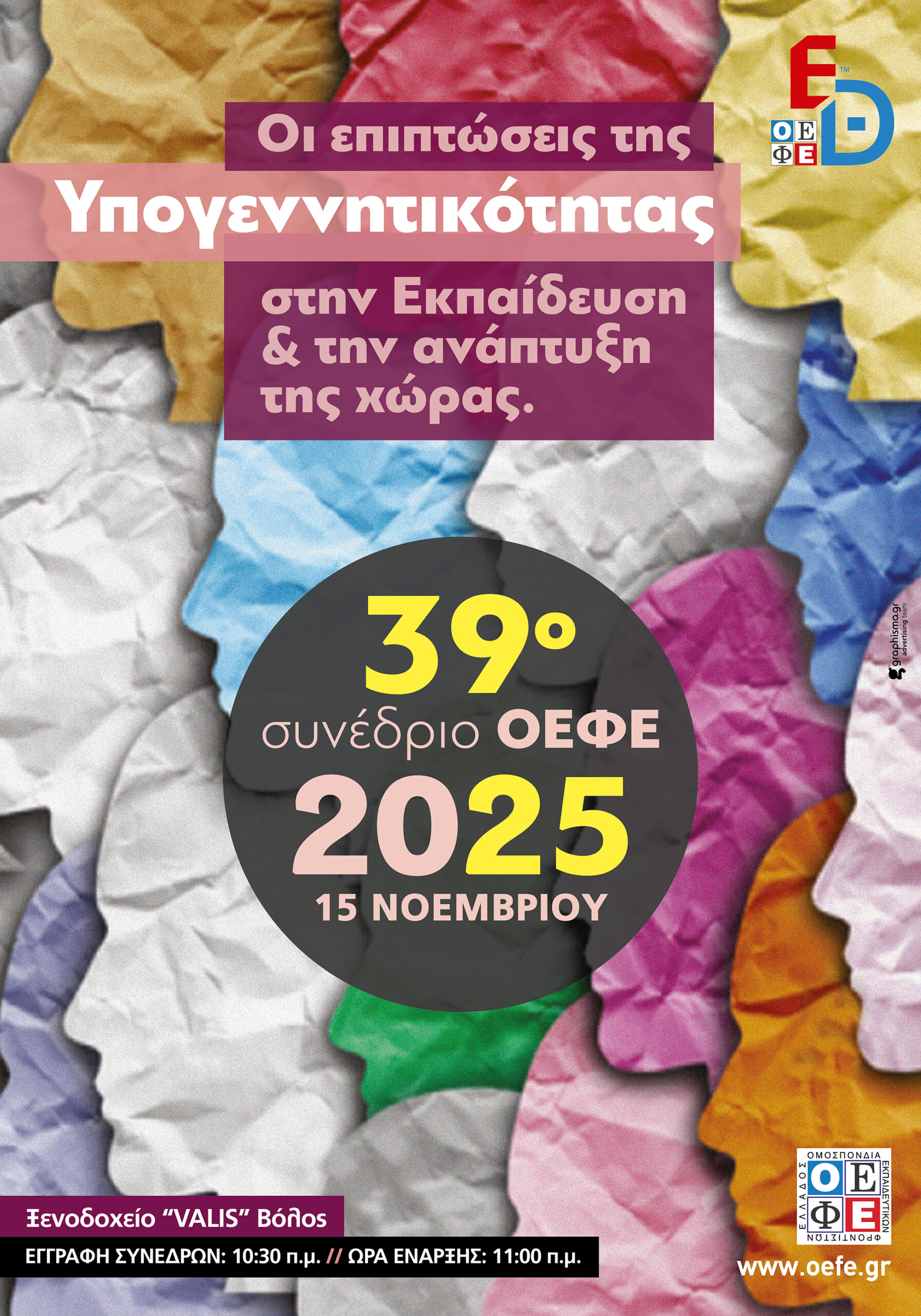 Με κεντρικό θέμα «Οι επιπτώσεις της υπογεννητικότητας στην Εκπαίδευση και στην Ανάπτυξη της χώρας» πραγματοποιείται το Σάββατο 15 Νοεμβρίου στο ξενοδοχείο Valis στην Αγριά Βόλου το 39ο Πανελλήνιο Συνέδριο της Ομοσπονδίας Εκπαιδευτικών Φροντιστών Ελλάδος (ΟΕΦΕ).