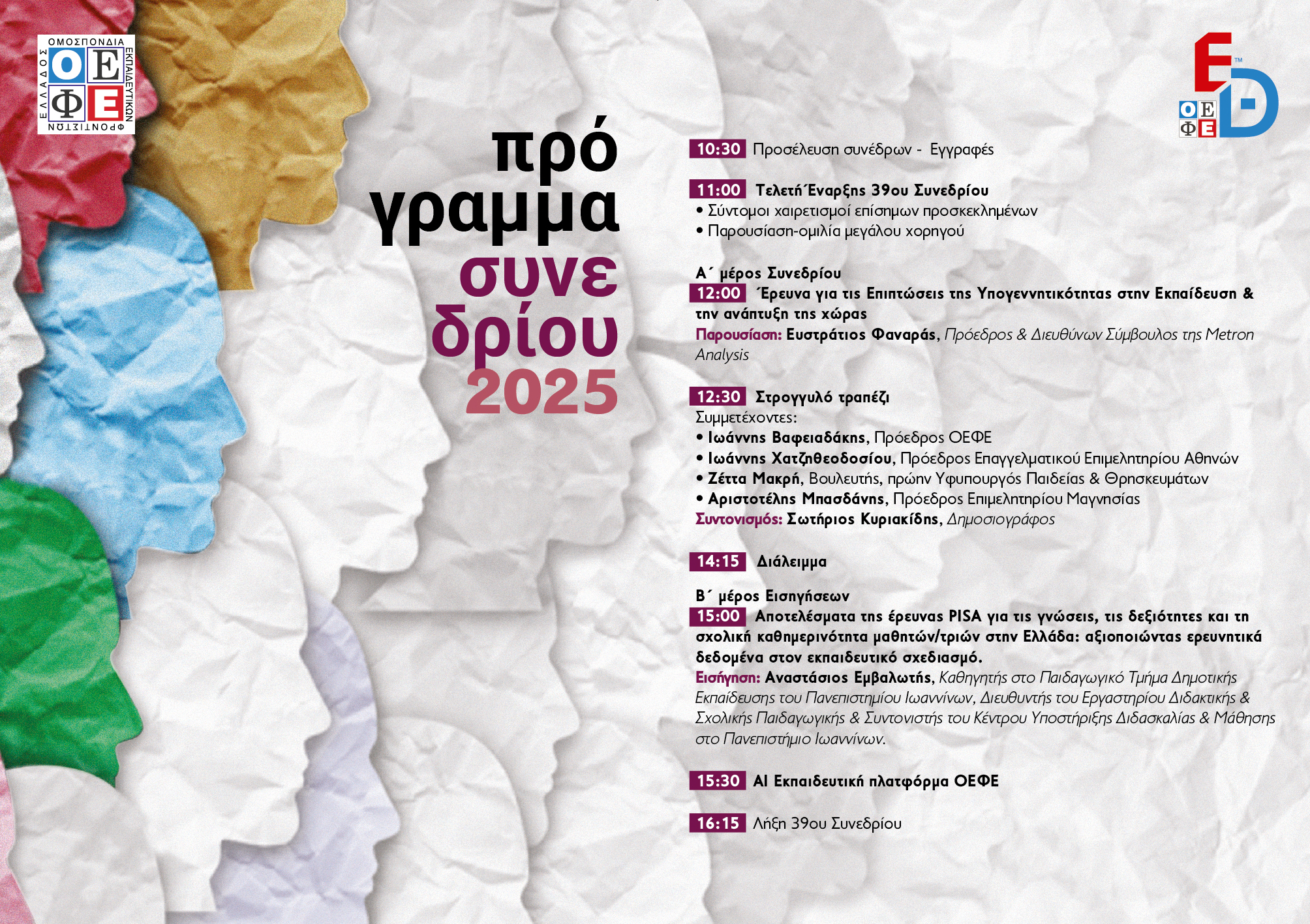 Ο πρόεδρος της ΟΕΦΕ κ. Ιωάννης Βαφειαδάκης δήλωσε πως «με μεγάλη χαρά η ΟΕΦΕ διοργανώνει το 39ο ετήσιο πανελλήνιο συνέδριό της στον Βόλο, μια περιοχή που έχει αναδείξει εξέχουσες προσωπικότητες από τον χώρο της εκπαίδευσης και του πολιτισμού, αποτελώντας συγχρόνως πόλη πρωτοπόρα στις παιδαγωγικές ιδέες, στις πολιτιστικές δημιουργίες και στα εργατικά κινήματα. Το φετινό μας θέμα επικεντρώνεται στην υπογεννητικότητα θέλοντας να αναδείξουμε τις επιπτώσεις τόσο στην εκπαίδευση όσο και στην ανάπτυξη της χώρας. Με ενδιαφέρον αναμένουμε να ακούσουμε σημαντικές εισηγήσεις και αναλύσεις, ενώ θα παρουσιαστεί και σπουδαία έρευνα για το ζήτημα η οποία, πιστεύουμε, θα αποτελέσει και ένα εργαλείο για αποφάσεις των αρμοδίων. Επίσης, στο συνέδριο θα παρουσιαστούν και αποτελέσματα της έρευνας PISA για τις γνώσεις, τις δεξιότητες και τη σχολική καθημερινότητα μαθητών και μαθητριών στην Ελλάδα δείχνοντας ουσιαστικά τις νέες τάσεις και αναγκαιότητες. Το Σάββατο 15 Νοεμβρίου θα βρεθούμε μαζί με τα μέλη της ΟΕΦΕ από όλη τη Ελλάδα και τους προσκεκλημένους μας σε ένα συνέδριο που ελπίζουμε ότι θα αφήσει το αποτύπωμά του στο δημόσιο διάλογο».