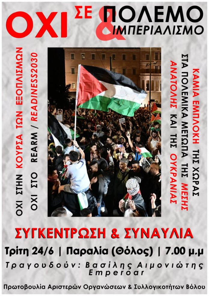 Αντιπολεμική συγκέντρωση και συναυλία θα πραγματοποιήσουν τα μέλη της Πρωτοβουλίας Αριστερών Οργανώσεων και Συλλογικοτήτων Βόλου την Τρίτη 24 Ιουνίου στις 7 το απόγευμα στο παραλιακό συγκρότημα Παπαστράτος του Πανεπιστημίου Θεσσαλίας. Στο τραγούδι θα είναι ο Βασίλης Αιμονιώτης και ο Emperoar. Σκοπός της συναυλίας είναι να σταλεί μήνυμα κατά των πολεμικών εξοπλισμών. Όπως αναφέρουν σε σχετική τους ανακοίνωση: «Αδυσώπητη η κούρσα των εξοπλισμών με όπλα μαζικής καταστροφής. ΗΠΑ-Ρωσία-Κίνα πρωτοστατούν με εξοπλιστικά προγράμματα τρισεκατομμυρίων δολαρίων για νέα πυρηνικά και αεροπλανοφόρα, βόμβες υδρογόνου τρομακτικής ισχύος, ακόμα και δορυφόρους με πυρηνικούς πυραύλους!
