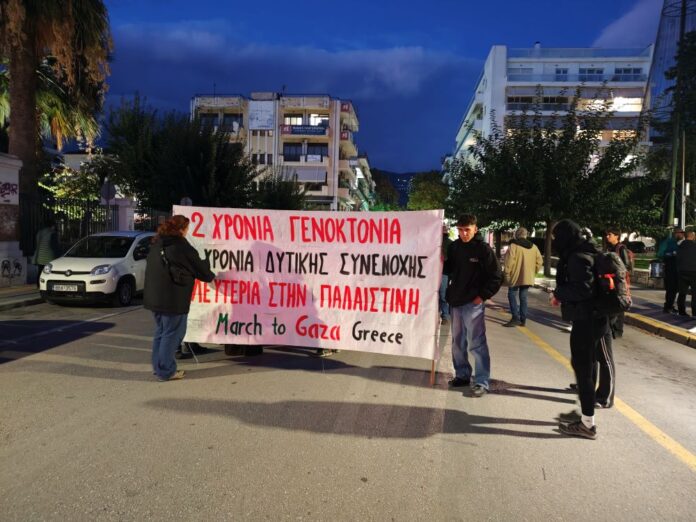 Να σταματήσει η συνεργασία της Ελλάδας με το Ισραήλ ζήτησαν φοιτητές και μέλη συλλογικοτήτων στο πλαίσιο συγκέντρωσης στην πλατεία Ελευθερίας και πορείας διαμαρτυρίας που πραγματοποίησαν στη συνέχεια, στο κέντρο του Βόλου.