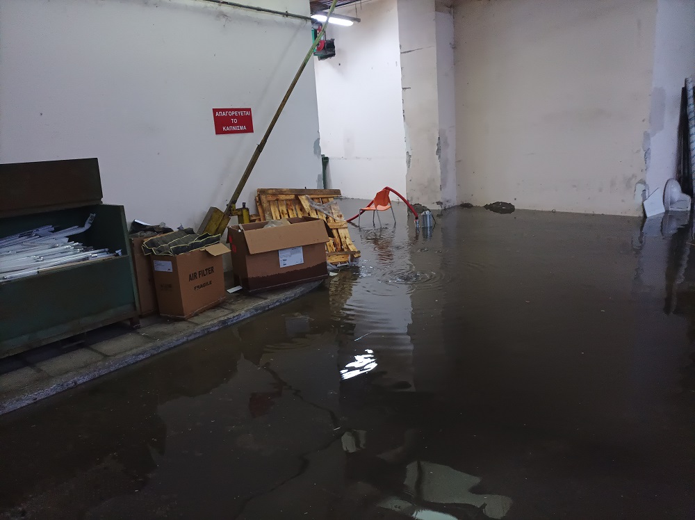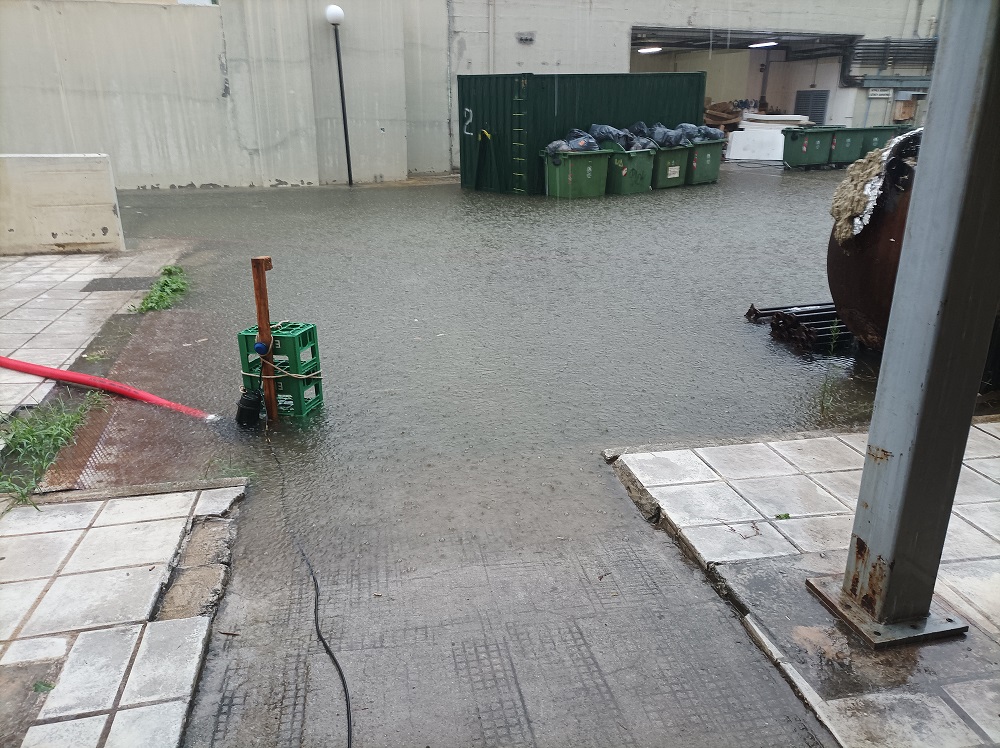 Κλιμάκιο της Πυροσβεστικής, αντλεί τα νερά που έχουν μαζευτεί στην πίσω μεριά στο υπόγειο του νοσοκομείου.