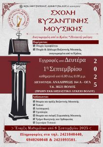 Ξεκίνησαν και συνεχίζονται οι εγγραφές στα Τμήματα Βυζαντινής Μουσικής της Σχολής και στο Τμήμα Φωνητικής και Ορθοφωνίας της Σχολής Βυζαντινής Μουσικής της Ιεράς Μητροπόλεως Δημητριάδος.