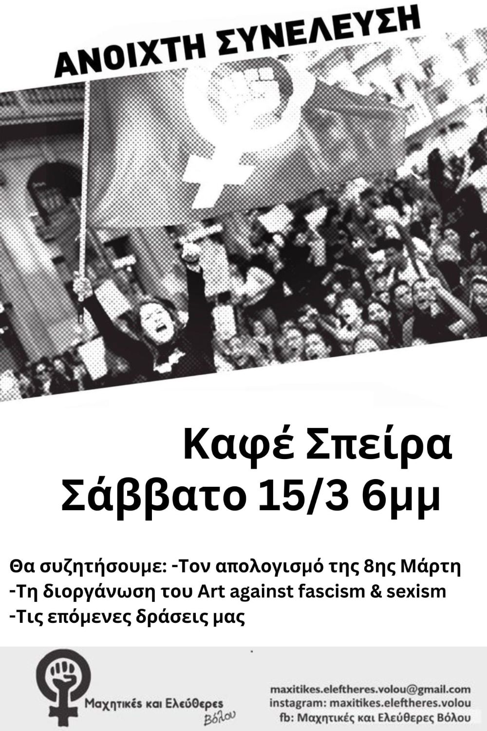 Η συνέλευση θα γίνει στο καφέ Σπείρα (Τ. Οικονομάκη με Δον Δαλεζίου) στις 6 το απόγευμα. Εκεί θα συζητηθεί ο απολογισμός των δράσεων της 8ης Μαρτίου και η διοργάνωση του Art against fascism & sexism.