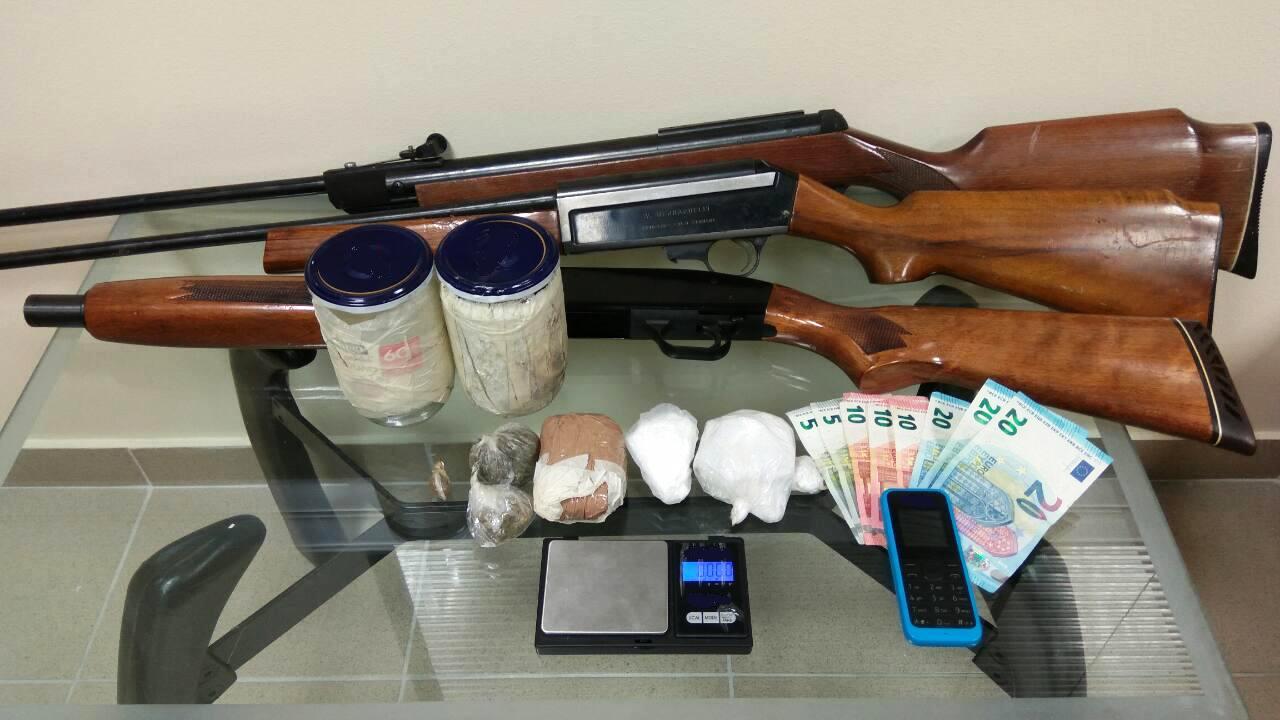 Σε νομότυπη έρευνα στο σπίτι του 60χρονου βρέθηκαν και κατασχέθηκαν σε ειδική κρύπτη που τα είχε κρύψει ο 60χρονος, δύο γυάλινα βάζα τα οποία περιείχαν, δύο ποσότητες χασίς βάρους 8,89 γρ, τρεις ποσότητες κοκαΐνης βάρος 93,95 γρ. (αντιστοιχούν σε περίπου 900 δόσεις), μία ποσότητα ηρωίνης βάρους 83,85 γρ. (αντιστοιχούν σε περίπου 830 δόσεις), μία ζυγαριά ακριβείας, το χρηματικό ποσό των 100 €, ένα κινητό τηλέφωνο και τρία κυνηγητικά όπλα τα οποία κατείχε παράνομα.