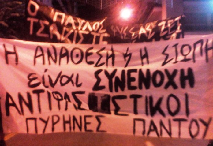 Αρκετές δεκάδες αντιεξουσιαστές, πολλοί από τους οποίος φορούσαν κουκούλες και κράνη, ξεκίνησαν την πορεία τους στις 8.30 από το Θόλο του Πανεπιστημίου στην οδό Ιάσονος.