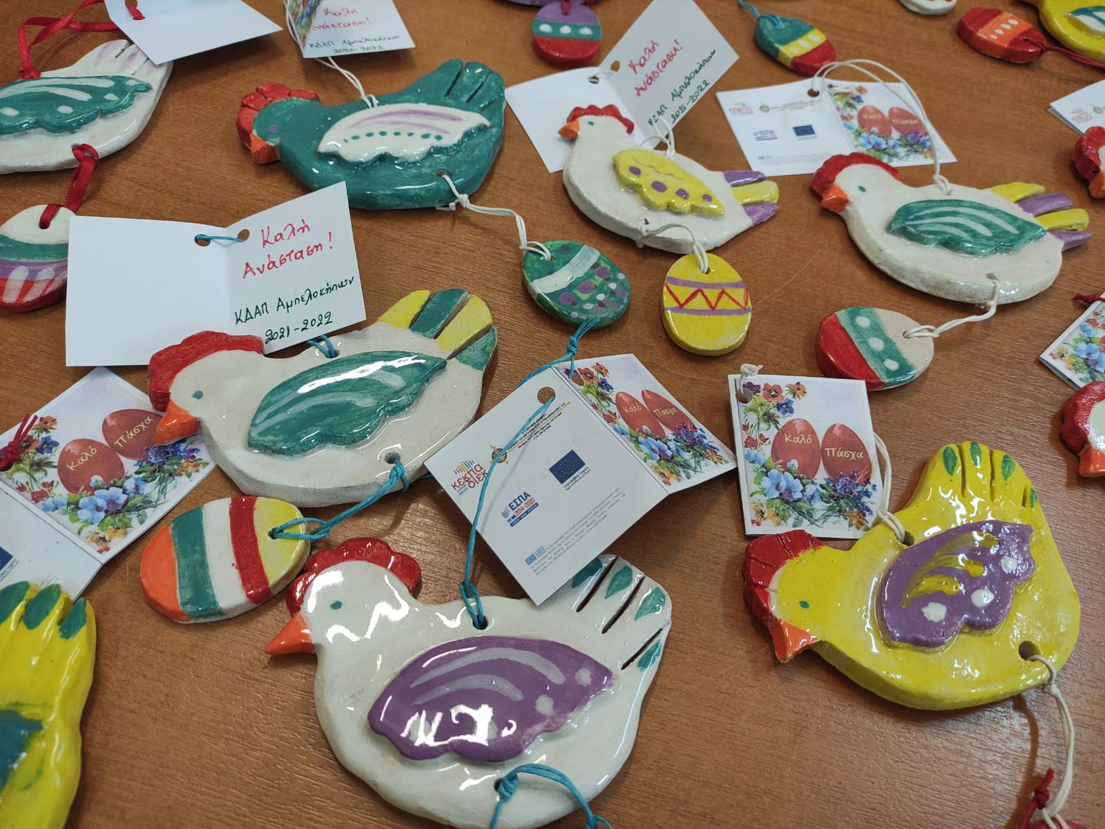 Το απογευματινό ολοκληρώθηκε με δώρα για τα παιδιά, χειροποίητες κεραμικές δημιουργίες φτιαγμένες από τις παιδαγωγούς-εμψυχώτριες του ΚΔΑΠ και διάφορες πασχαλινές λιχουδιές.