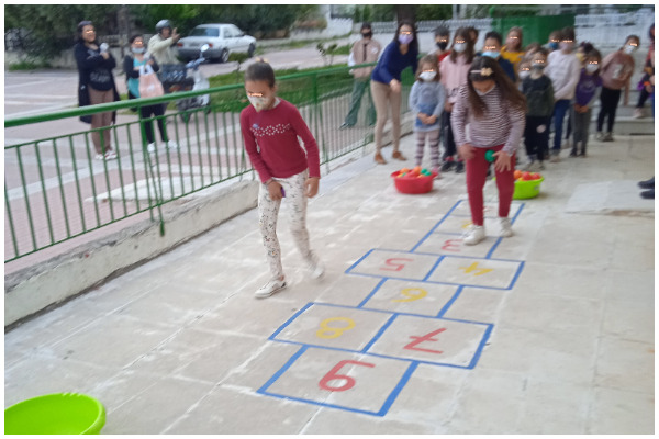 Στη συνέχεια, τα παιδιά μεταμορφώθηκαν σε μικρές «κοτούλες» σε ένα διασκεδαστικό παιχνίδι ταχύτητας και στόχου, όπου τα παιδιά καλούνταν να μεταφέρουν το αυγό τους ανάμεσα στα πόδια τους, καλύπτοντας μία απόσταση ώστε να το ρίξουν μέσα στο καλάθι τους.