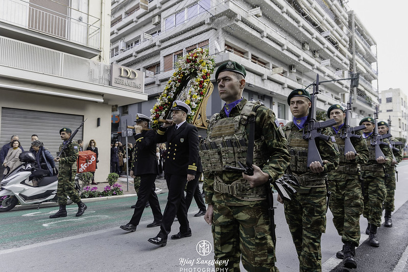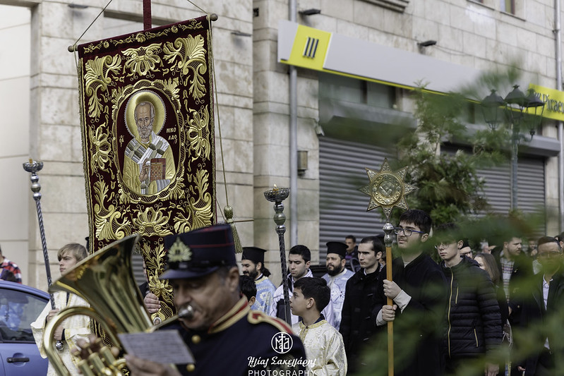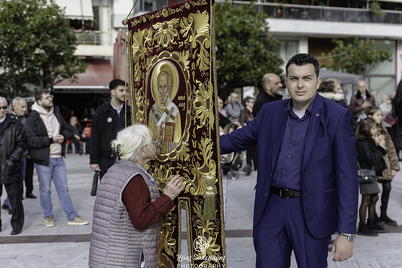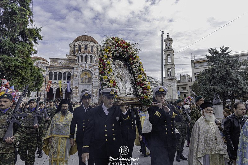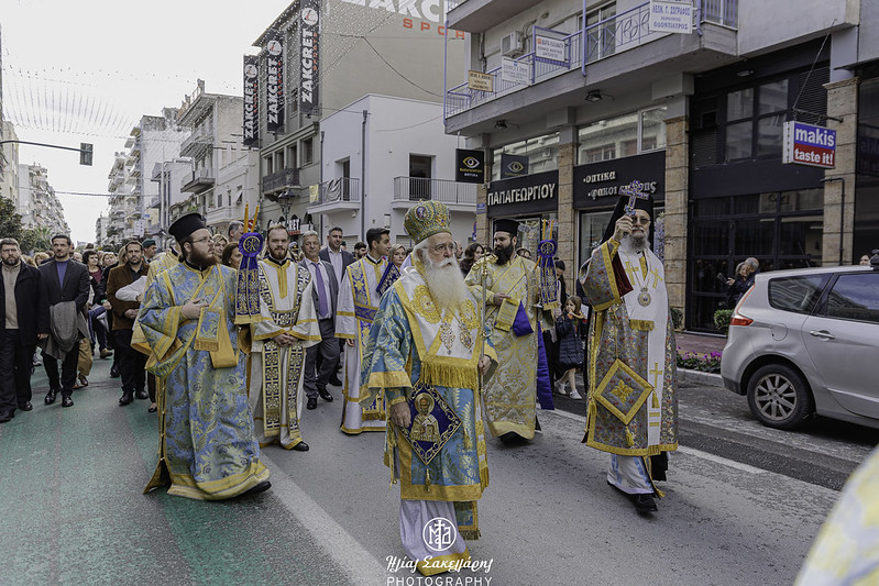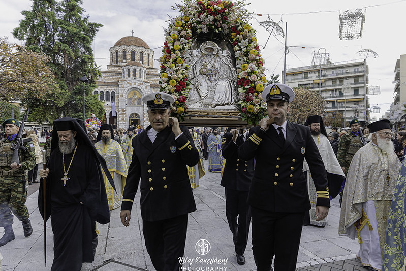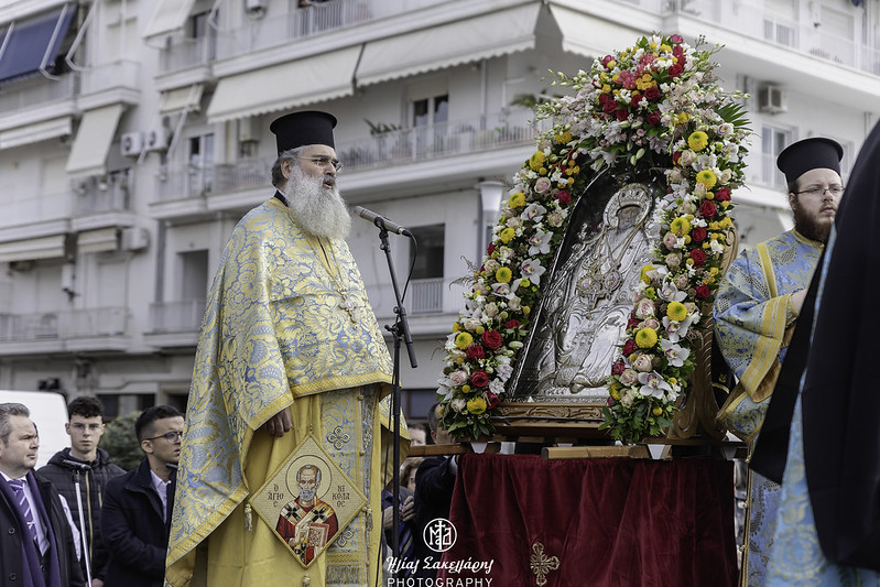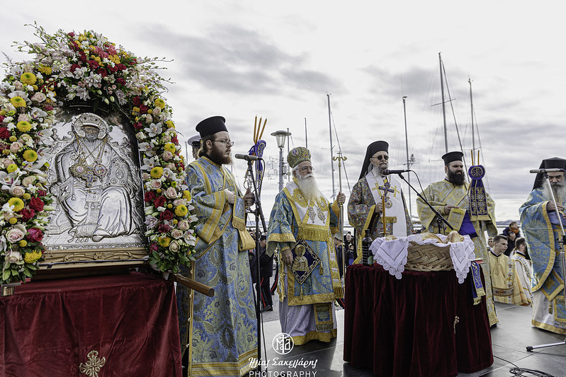 Ακολούθησε η λιτάνευση της Ιεράς Εικόνος και του Ιερού Λειψάνου του Αγίου Νικολάου, καθώς και της Ιεράς Εικόνος της Παναγίας Εικονιστρίας στους δρόμους της πόλης, υπό τους ήχους της Φιλαρμονικής του Δήμου Βόλου, συνοδεία στρατιωτικού αγήματος, όπου τελέστηκε η αρτοκλασία και ο Σεβ. Μητροπολίτης μας κ. Ιγνάτιος απηύθυνε εόρτιο χαιρετισμό. Ευχαρίστησε τον προσκεκλημένο Ιεράρχη για την ευλογητή συμμετοχή του στην πανήγυρή μας· εξήρε την παρουσία της Ιεράς Εικόνος της Παναγίας Εικονιστρίας από την Σκιάθο και απέστειλε τις θερμές του ευχαριστίες στον Σεβ. Μητροπολίτη Χαλκίδος κ. Χρυσόστομο, που έδωσε την άδεια για την μεταφορά της στον τόπο μας. Αναφέρθηκε στους κορυφαίους θεσμούς που λειτουργούν υπό την ευθύνη της Τοπικής μας Εκκλησίας, στον χώρο της Υγείας, με το Άτυπο Δίκτυο Λειτουργών Υγείας, όπου συμμετέχουν δεκάδες σχετικών φορέων, στον χώρο του Πολιτισμού, με την «Μαγνήτων Κιβωτό», που διασώζει και αναδεικνύει το πολιτιστικό απόθεμα της Μαγνησίας και στον χώρο της Θεολογίας και του Διαχριστιανικού Διαλόγου, με την Ακαδημία Θεολογικών Σπουδών. Θύμισε την ενότητα του λαού μας, σε δύσκολες περιόδους, με την καθοριστική συμβολή της Εκκλησίας μας, όπως κατά την μακρά οικονομική κρίση και την εποχή των μεγάλων φυσικών καταστροφών. Ειδική και δυναμική αναφορά έκανε ο Ποιμενάρχης μας στην θάλασσα, που μας περιβάλλει: «έχουμε ενώσει τις δυνάμεις μας, για να διασώσουμε τον όμορφο Παγασητικό κόλπο. Θέλουμε να τον κρατήσουμε ζωντανό και καθαρό και δεν πρέπει να επιτρέψουμε οτιδήποτε θα προκαλέσει μόλυνση και καταστροφή. Αυτό που διακηρύσσεται υπέρ του περιβάλλοντος, πρέπει να τηρείται. Χρειάζονται προληπτικά μέτρα, για να αποτραπεί η μόλυνση της θάλασσας και του ευρύτερου φυσικού περιβάλλοντός μας».