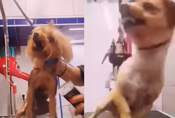 Στο επίμαχο βίντεο η εν λόγω groomer φαίνεται να προσπαθεί να κουρέψει ένα σκύλο νεαρής ηλικίας. Όταν, όμως, το μικρό ζώο πανικοβάλλεται και τη δαγκώνει, εκείνη αρχίζει να του φωνάζει, να το τρομοκρατεί χτυπώντας το χέρι στο τραπέζι και να τραβάει το σώμα του επανειλημμένα, παρότι ήταν δεμένο από τον λαιμό με λουρί.