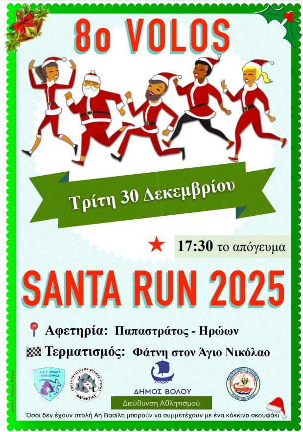 Στο πλαίσιο των εορταστικών εκδηλώσεων του Δήμου Βόλου, η Διεύθυνση Αθλητισμού του Δήμου Βόλου, με την υποστήριξη του Κένταυρου Βόλου, της Ένωσης Πτυχιούχων Φυσικής Αγωγής Μαγνησίας και της Λέσχης Ειδικών Δυνάμεων, διοργανώνει φιλανθρωπική δρομική εκδήλωση «8ο Volos Santa Run» την Τρίτη 30 Δεκεμβρίου στις 17:30. Επιλέχθηκε μια γιορτινή, όμορφη, απλή διαδρομή, ώστε να μπορούν να συμμετέχουν όλοι οι πολίτες κάθε ηλικίας, με φίλους ή με την οικογένειά τους, ακόμα και βαδίζοντας!