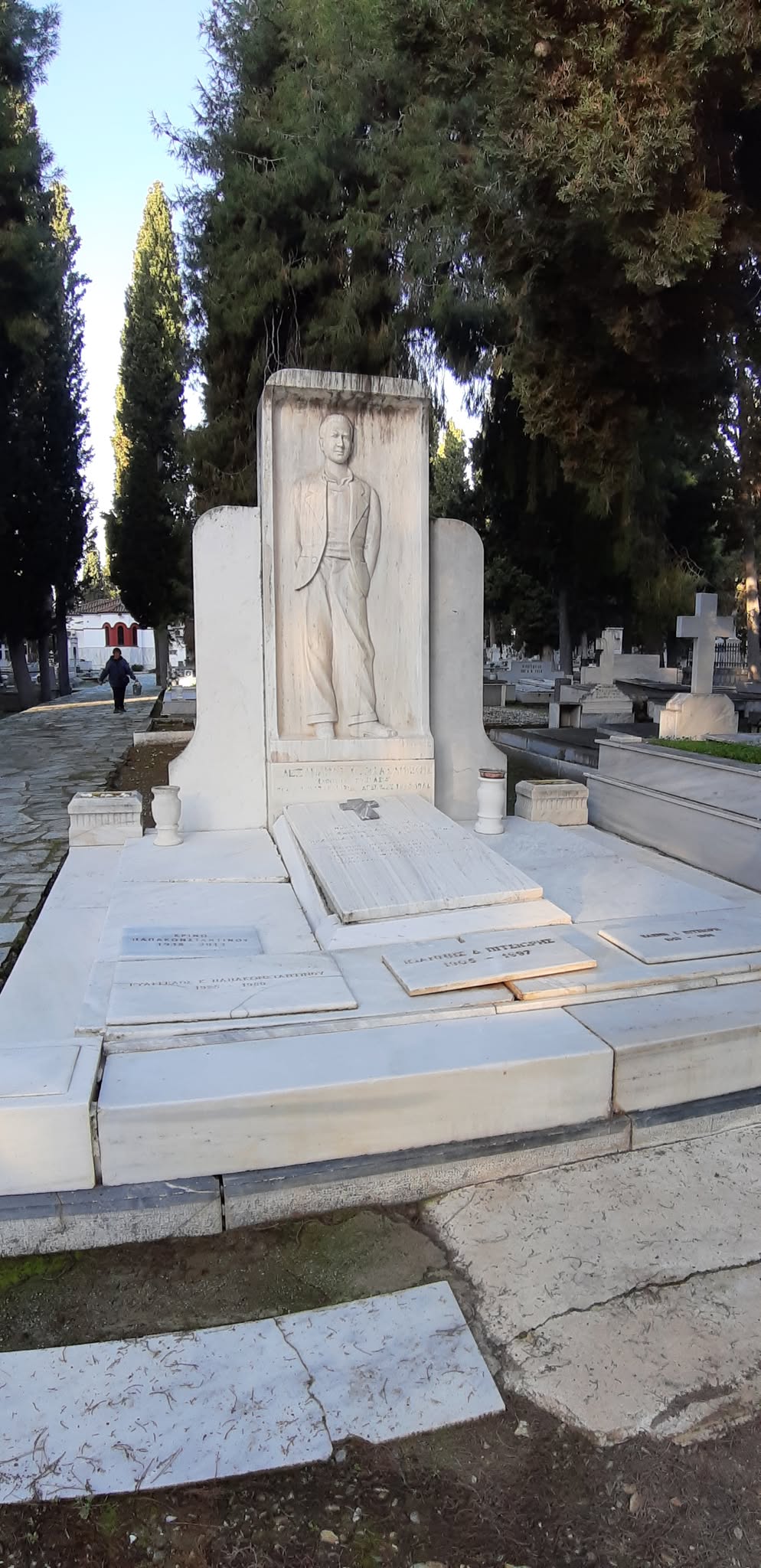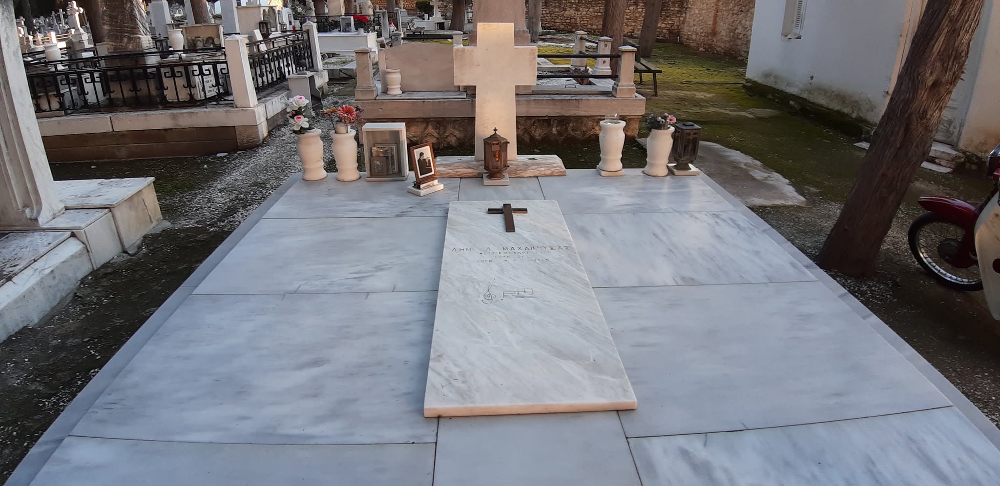 Μπαίνοντας στον χώρο, το πρώτο μνήμα, που αντικρύζει κανείς, είναι αυτό, του πατέρα του Λαυρέντη Μαχαιρίτσα, εμβληματικό και ταυτόχρονα λιτό…Πέθανε το 1969, όταν ο Λαυρέντης ήταν τότε 13 ετών…