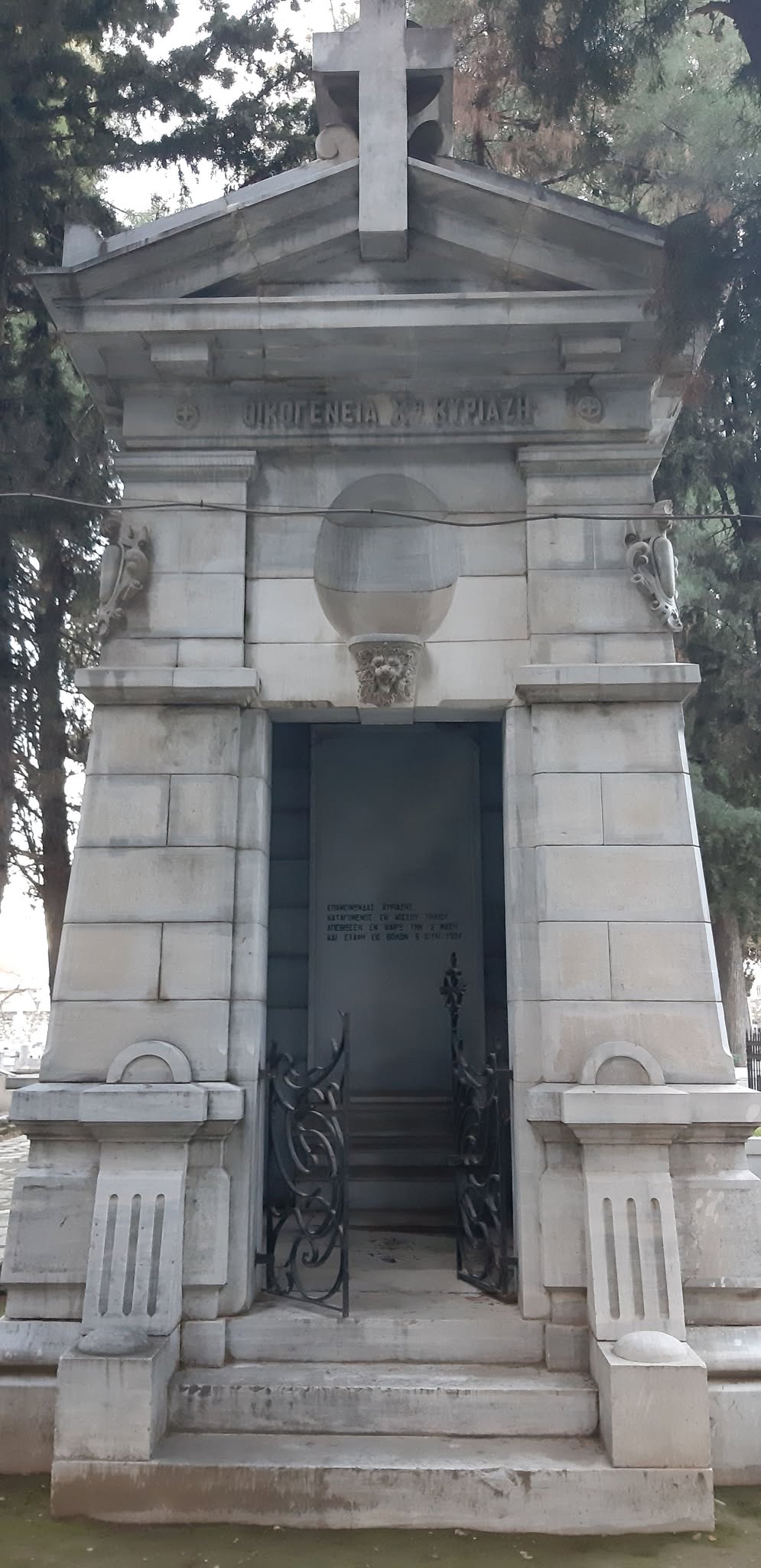Λίγο πιο πάνω ένα εντυπωσιακό μαρμάρινο κτίσμα κεντρίζει το ενδιαφέρον. «Επαμεινώνδας Κυριαζής. Καταγόμενος εκ Κισσού Πηλίου. Απεβίωσε εν καιρώ την 2 Μαΐου και ετάφη εις Βόλον 3 Ιουνίου 1907», γράφει εντός του επιβλητικού κτίσματος.