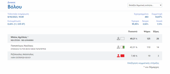 Το πρώτο εκλογικό αποτέλεσμα για τις δημοτικές εκλογές στον Δήμο Βόλου ανακοινώθηκε προ ολίγου και δίνει τα εξής ποσοστά: