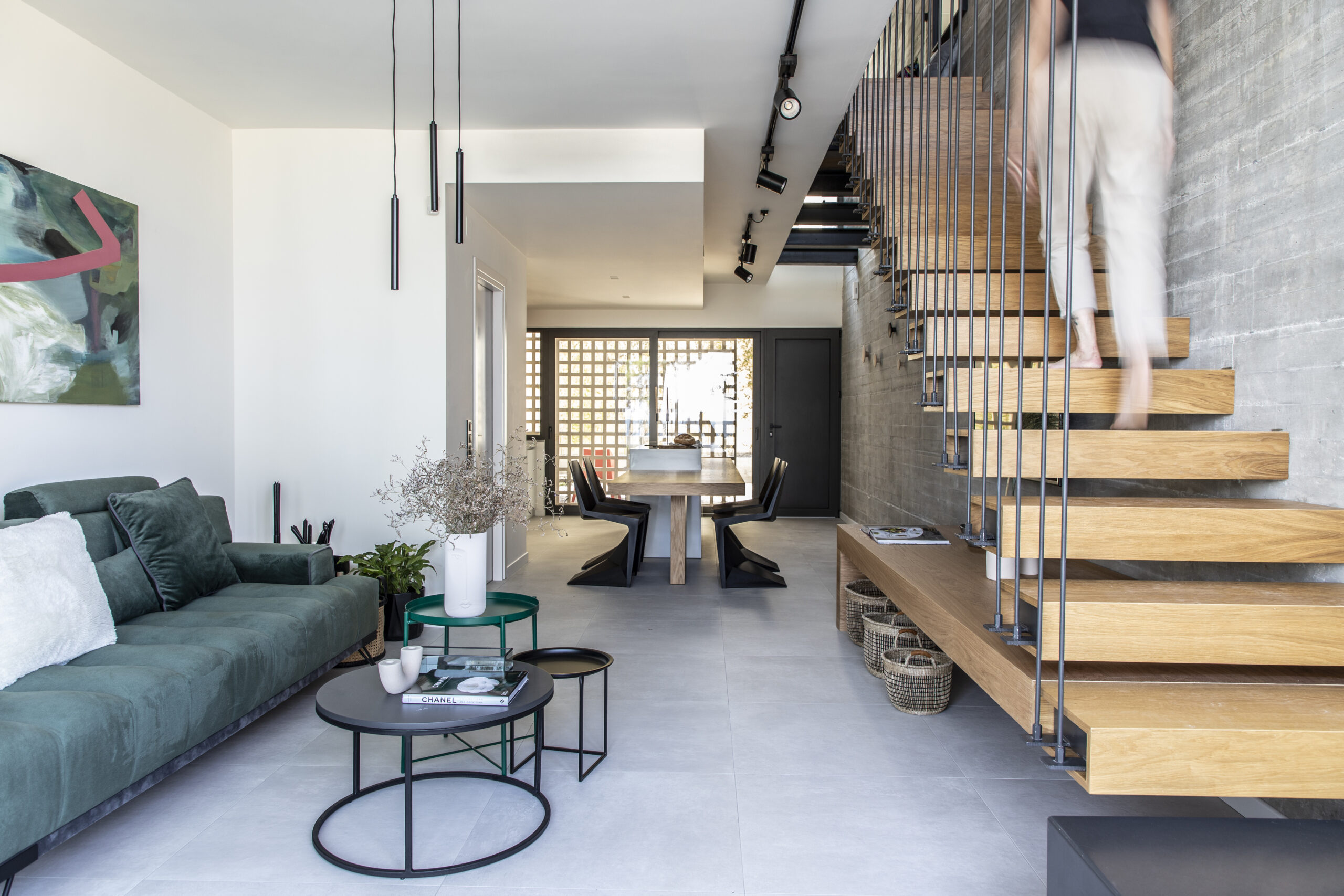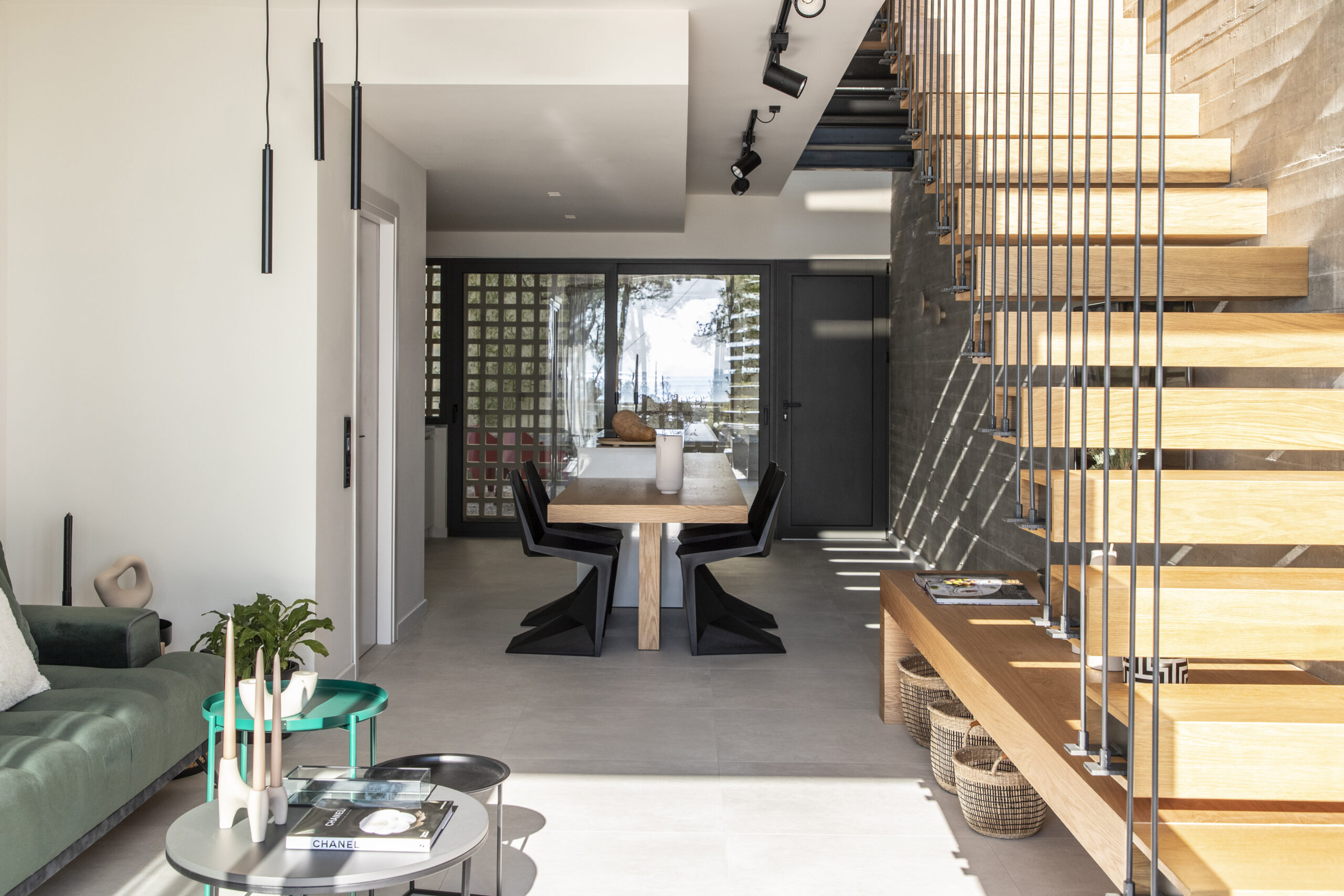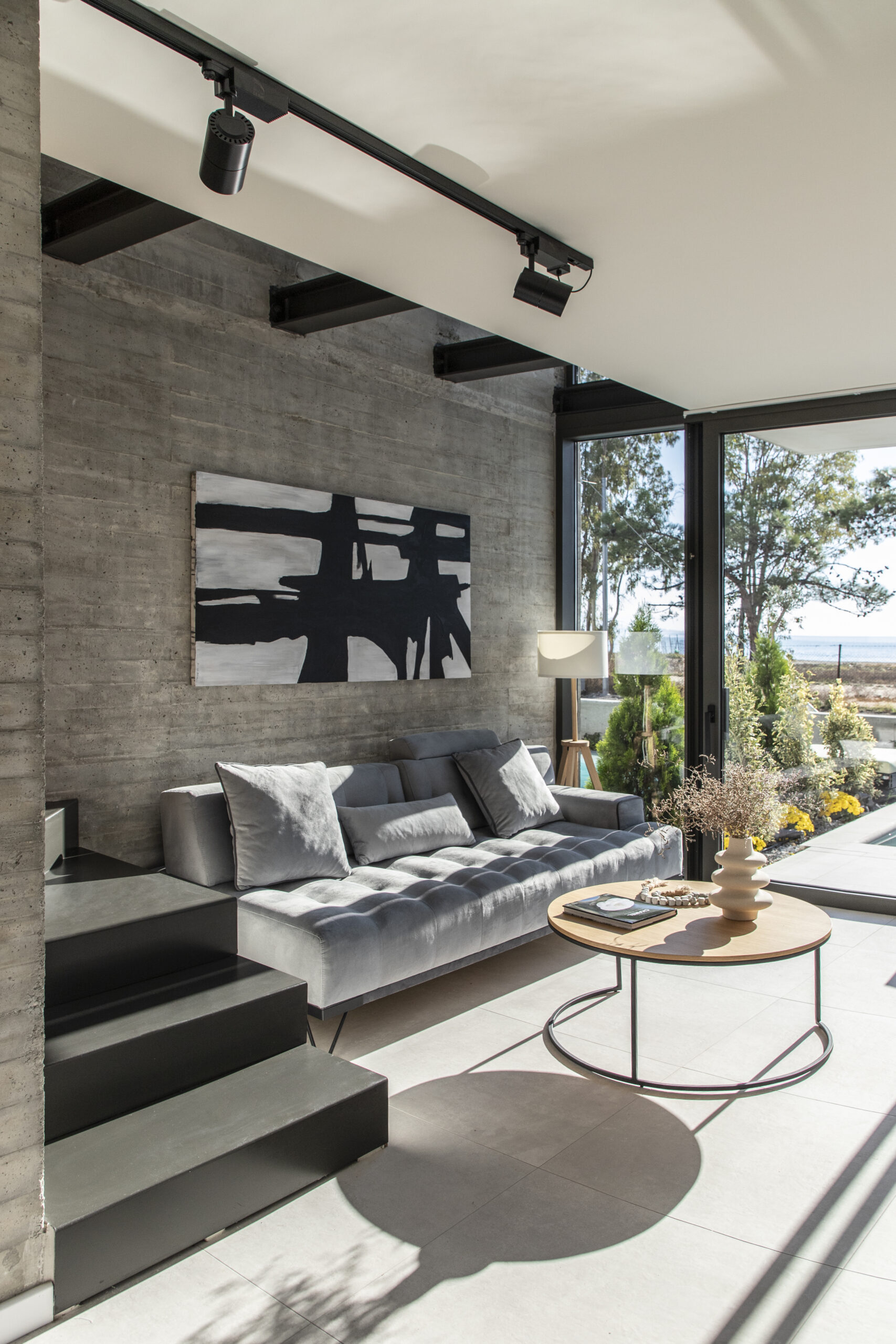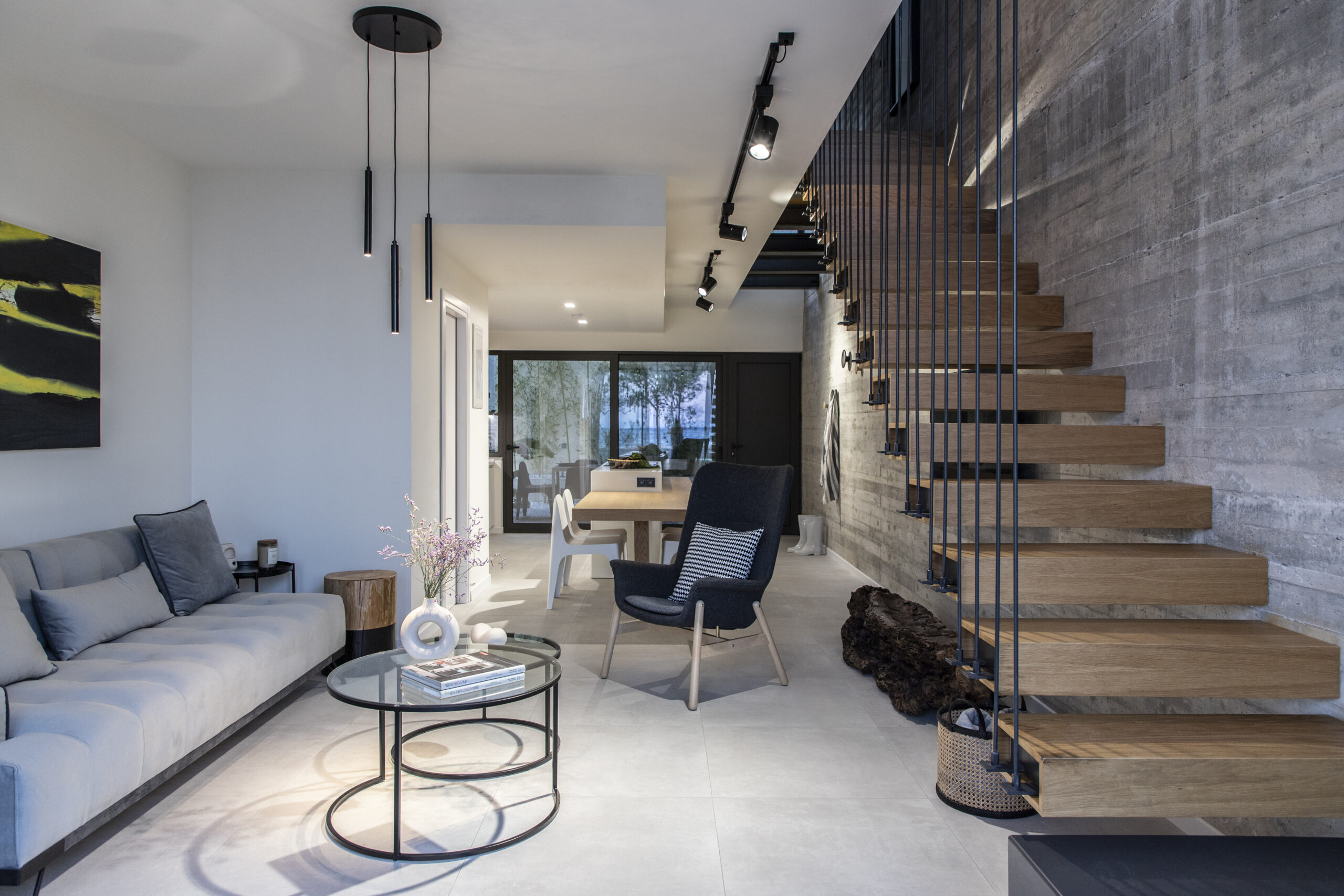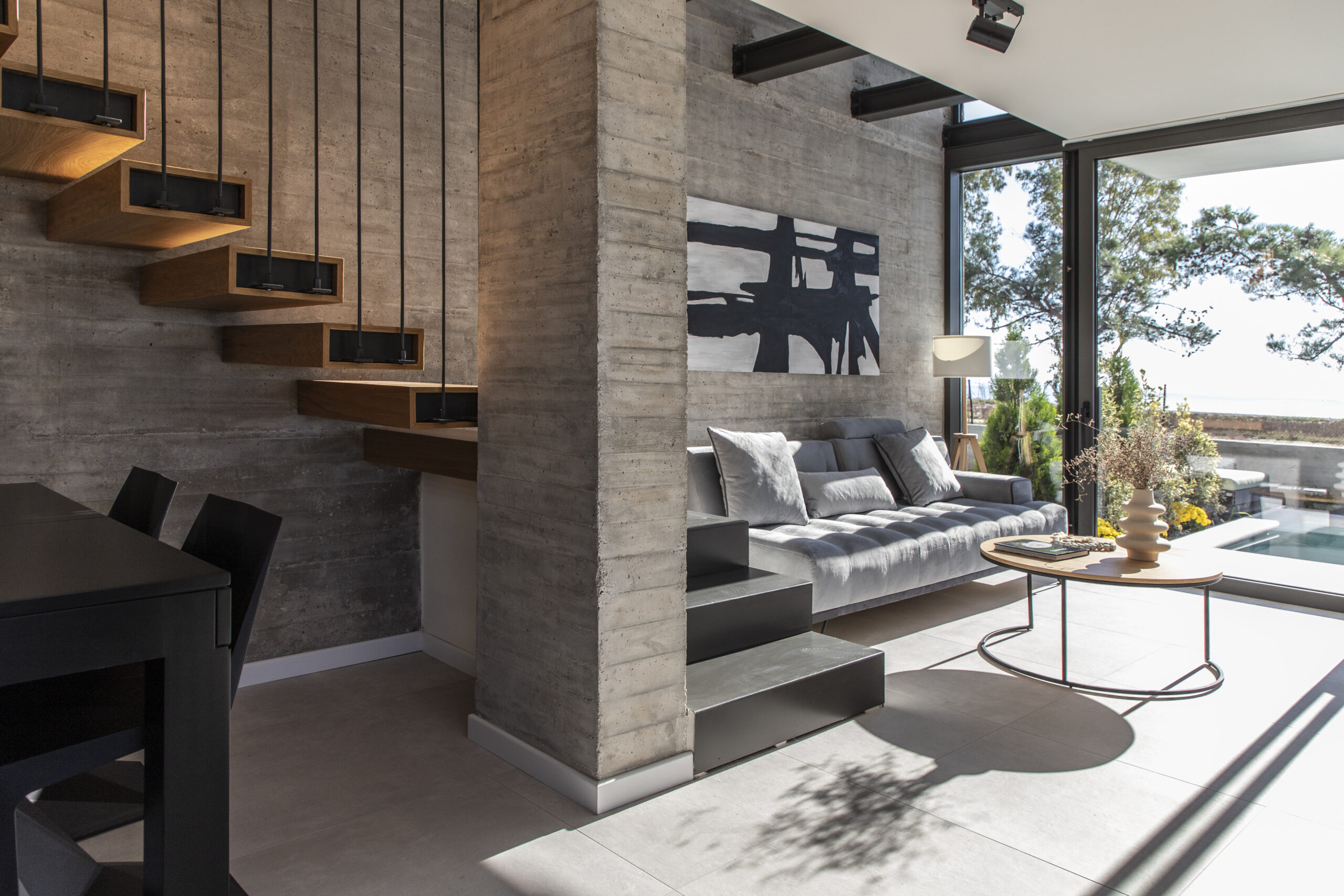 Το καθιστικό οπτικά εκτείνεται και στην μπροστινή βεράντα, καθώς η τζαμαρία που καταλαμβάνει όλο το πλάτος του χώρου αφήνει να χαθούν τα όρια του εσωτερικού χώρου με τον εξωτερικό. Αναρτημένα μεταλλικά σκαλοπάτια με φόντο τον τοίχο από εμφανές σκυρόδεμα οδηγούν στα υπνοδωμάτια του ορόφου.