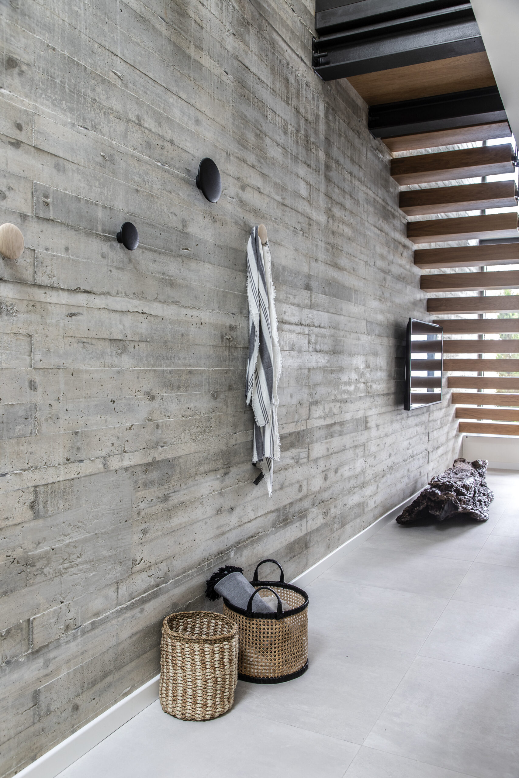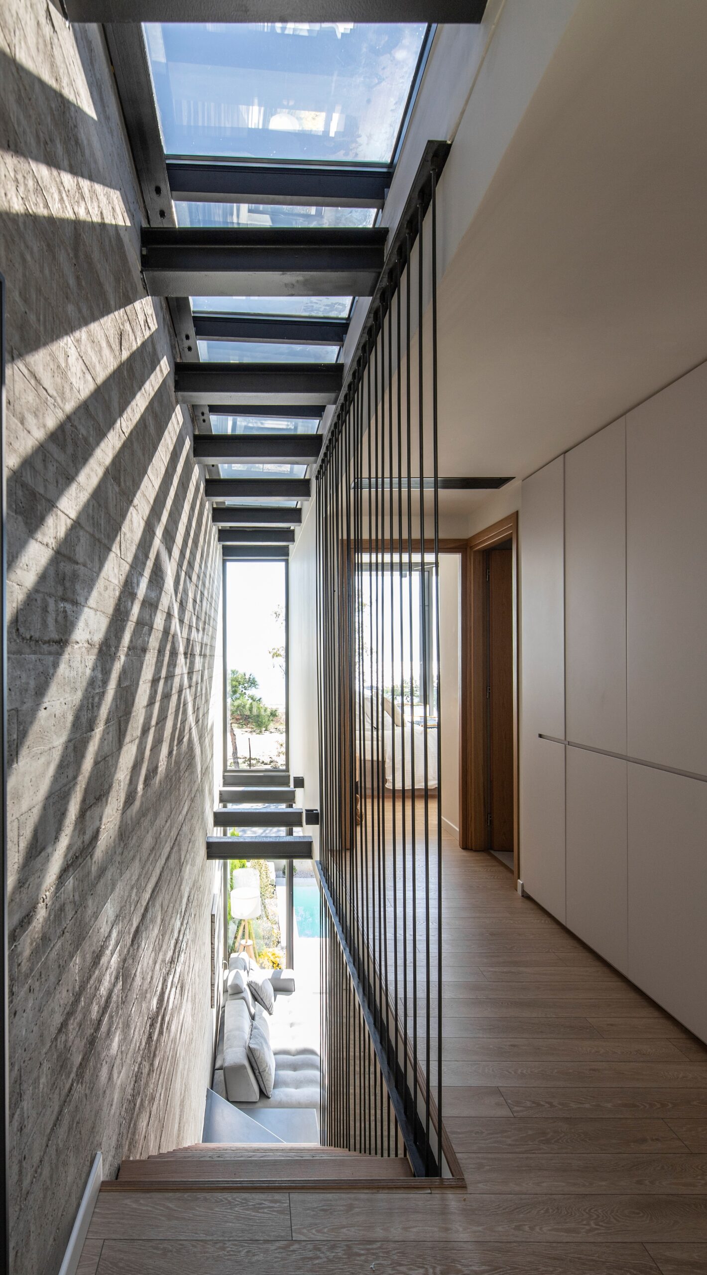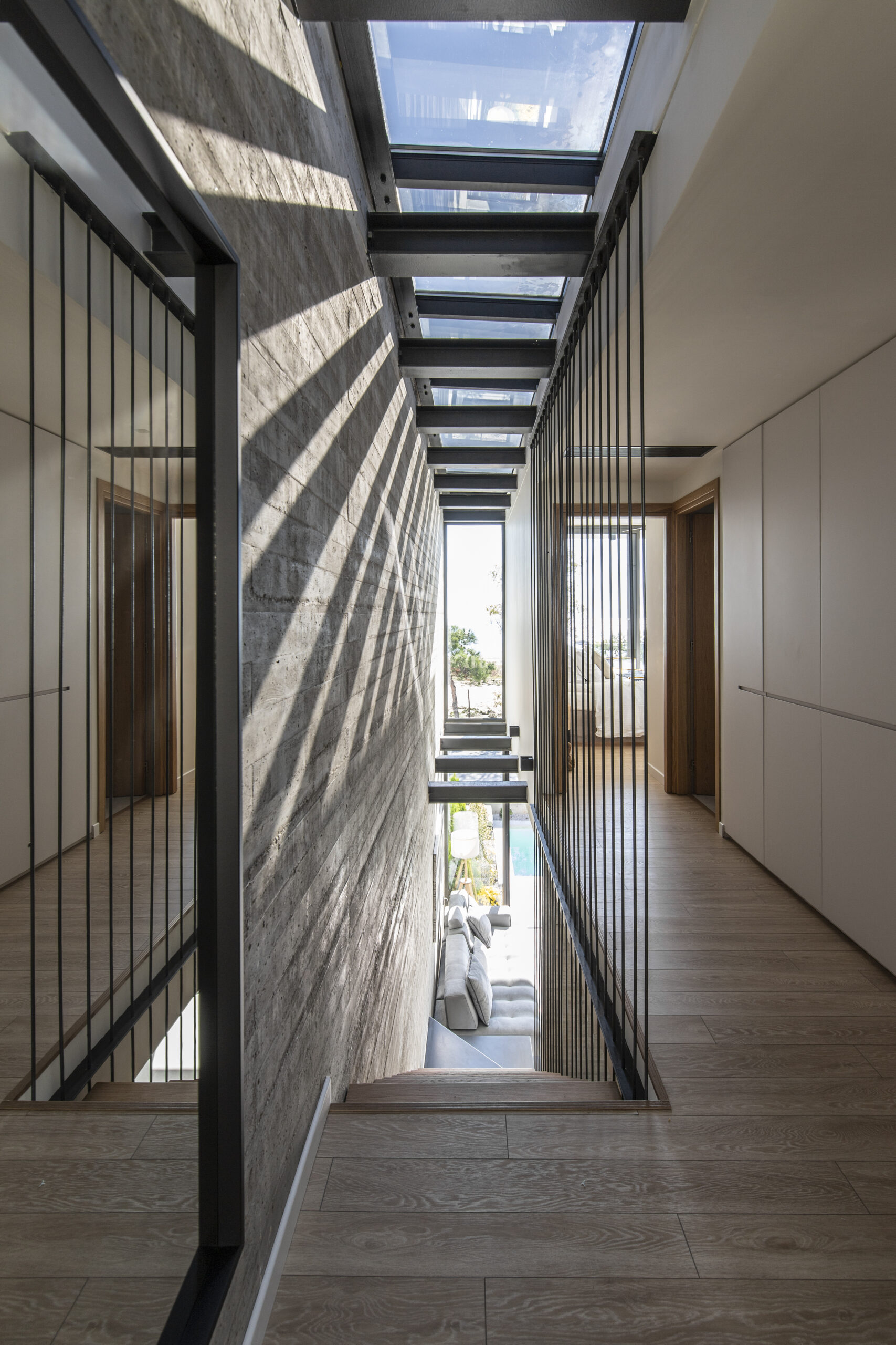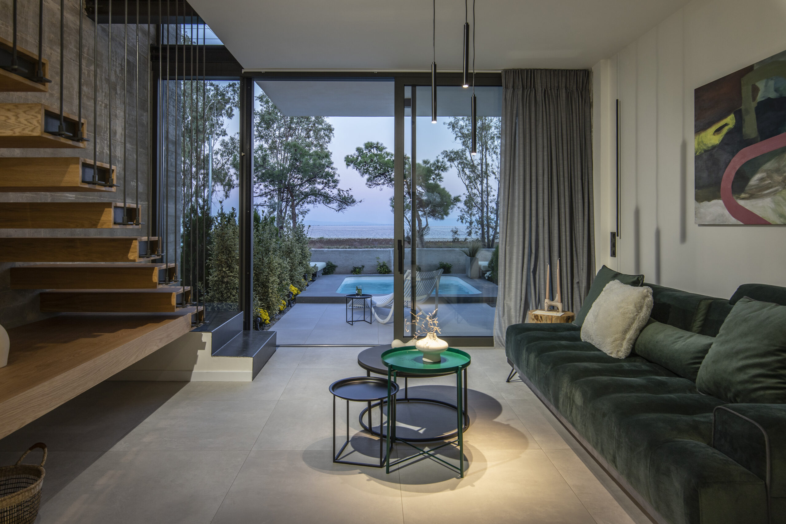 Το καθιστικό οπτικά εκτείνεται και στην μπροστινή βεράντα, καθώς η τζαμαρία που καταλαμβάνει όλο το πλάτος του χώρου αφήνει να χαθούν τα όρια του εσωτερικού χώρου με τον εξωτερικό. Αναρτημένα μεταλλικά σκαλοπάτια με φόντο τον τοίχο από εμφανές σκυρόδεμα οδηγούν στα υπνοδωμάτια του ορόφου.