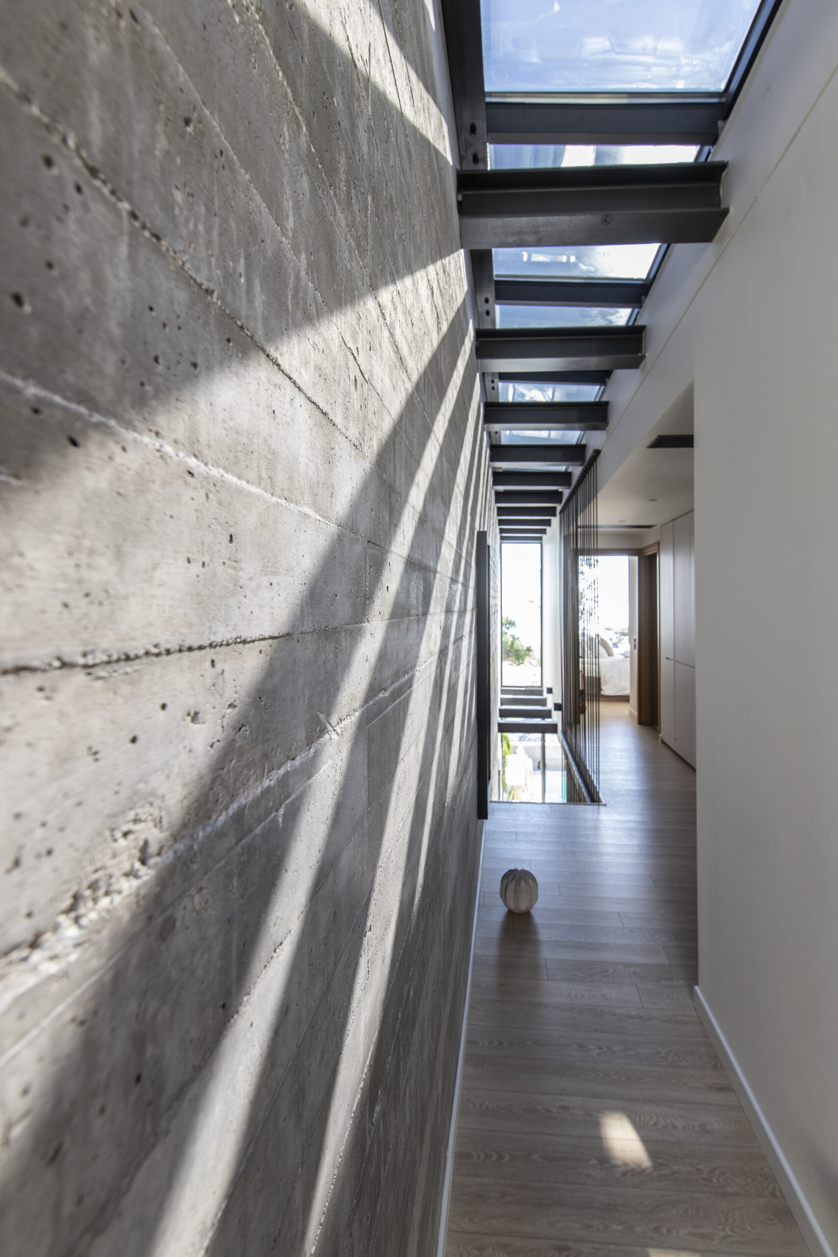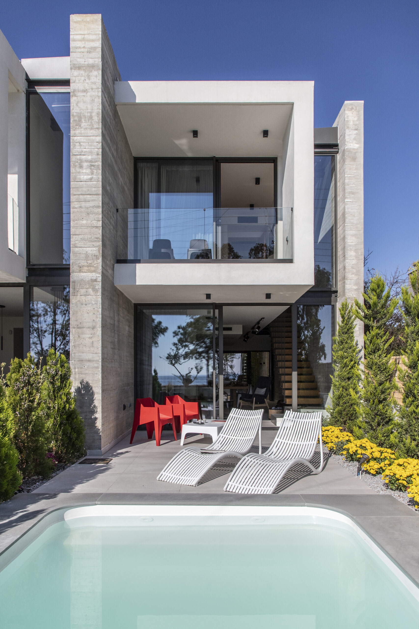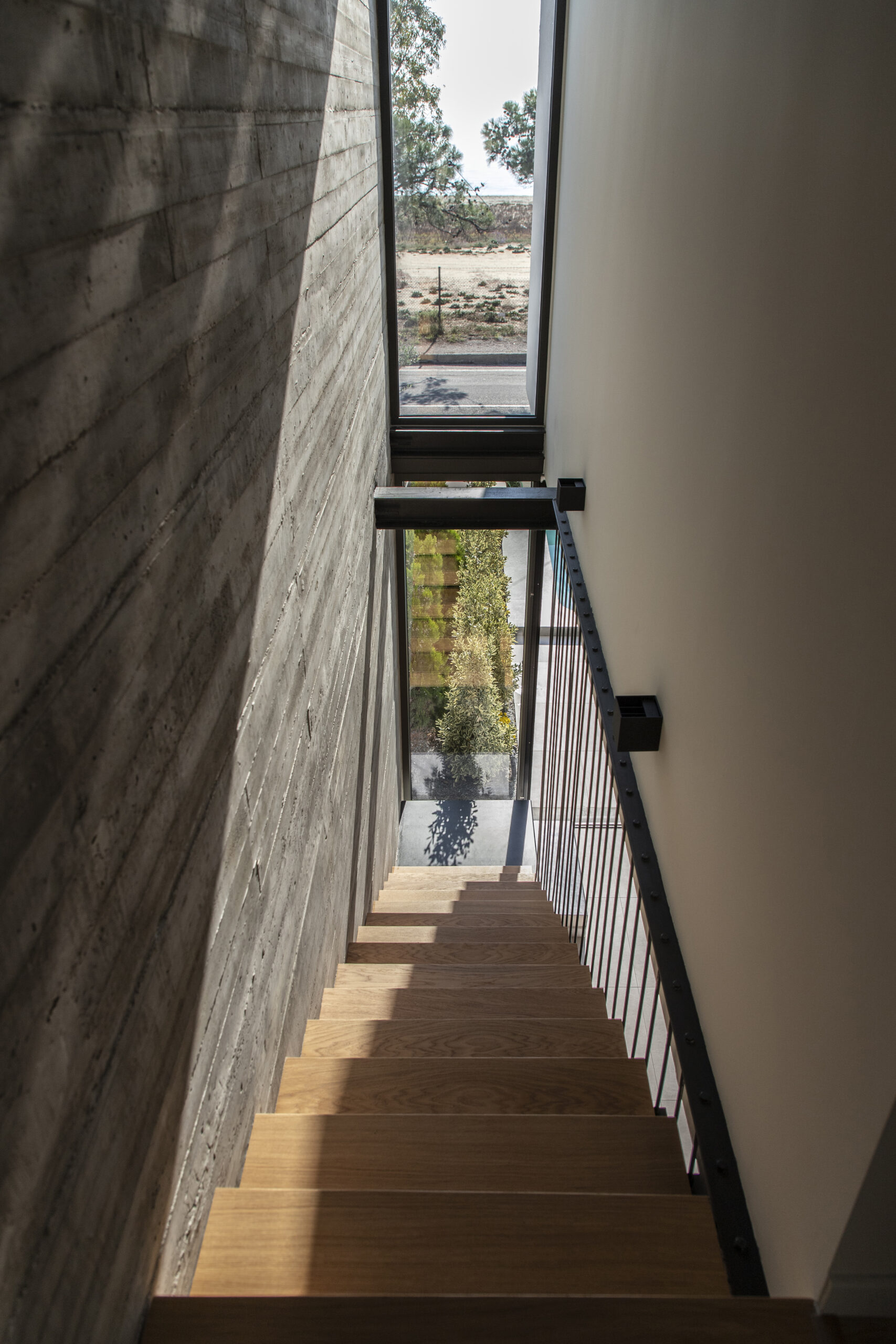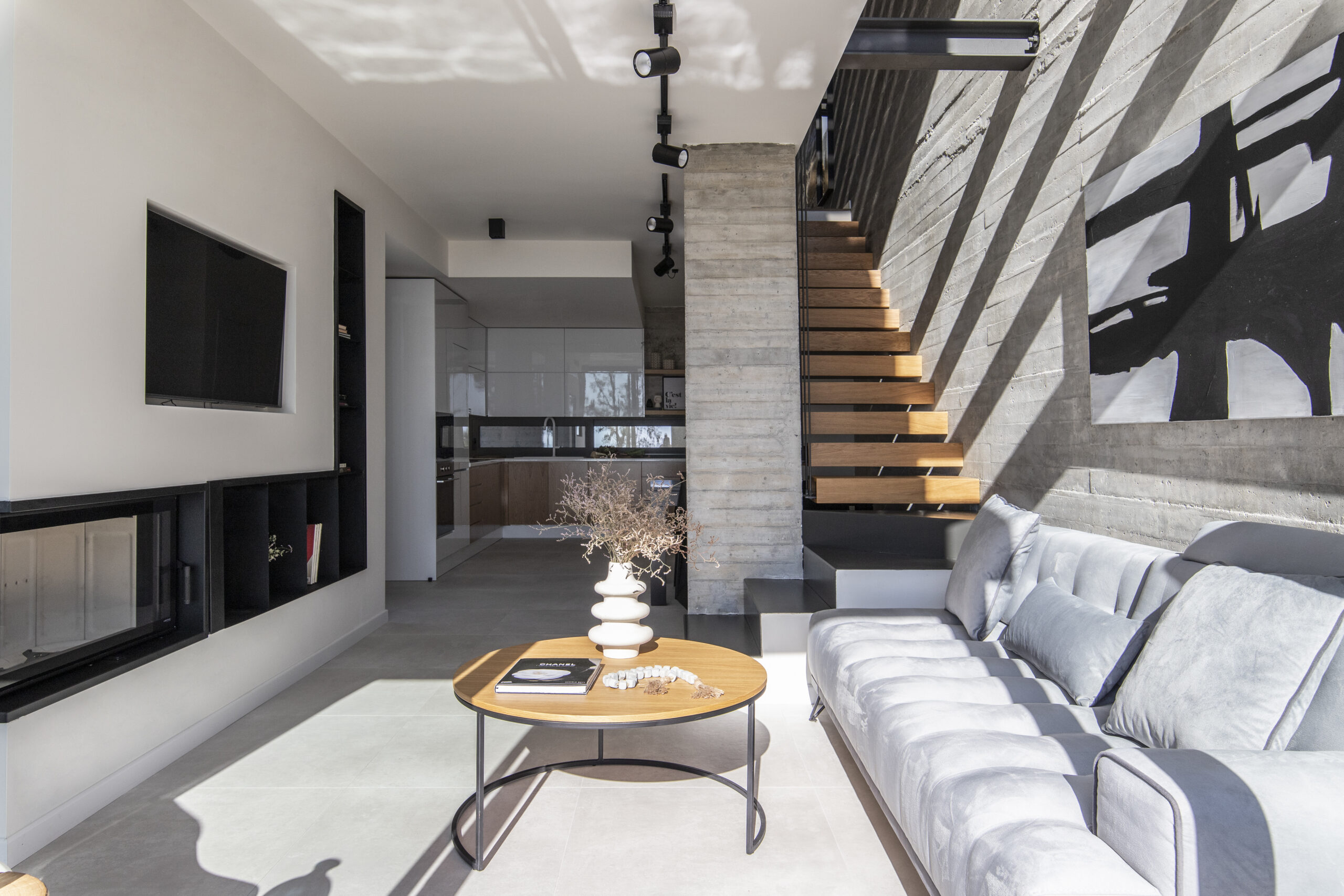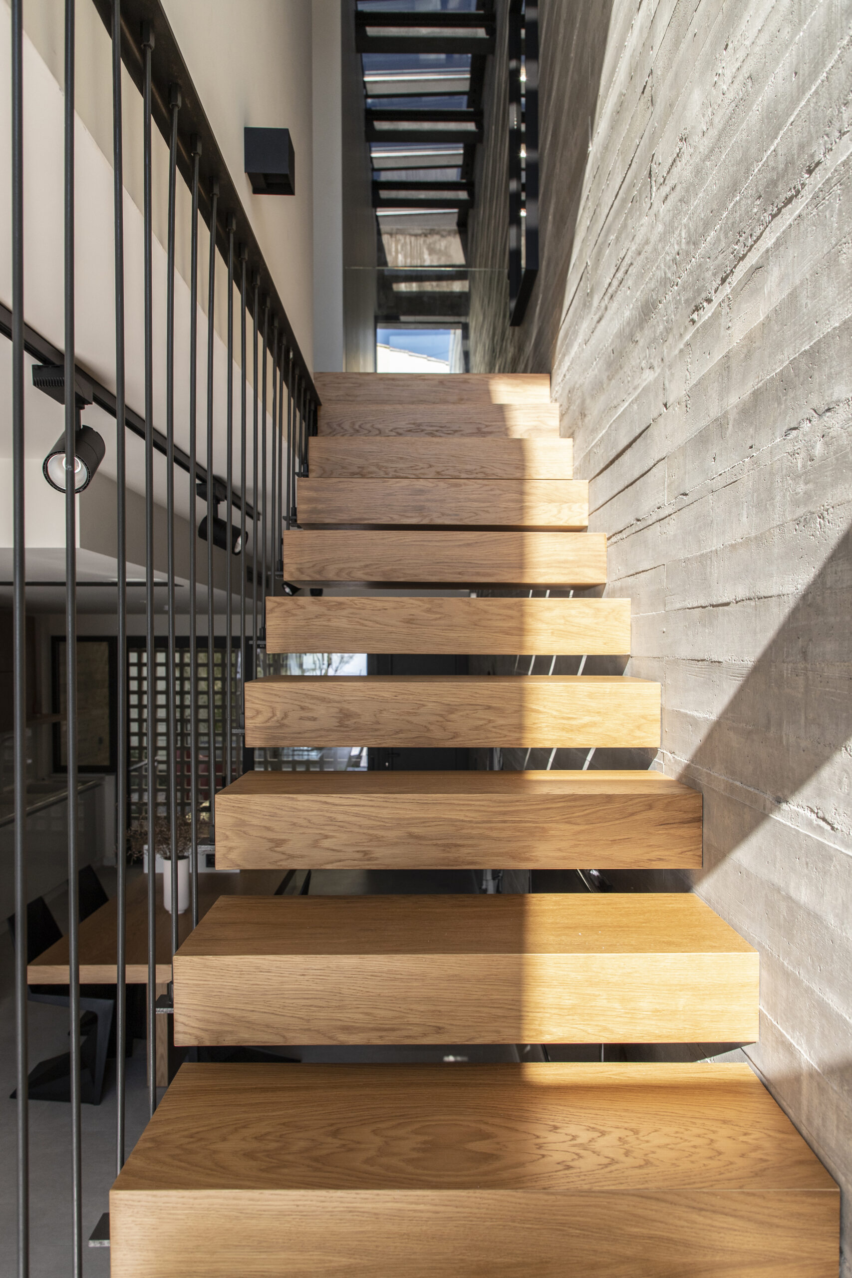 Το καθιστικό οπτικά εκτείνεται και στην μπροστινή βεράντα, καθώς η τζαμαρία που καταλαμβάνει όλο το πλάτος του χώρου αφήνει να χαθούν τα όρια του εσωτερικού χώρου με τον εξωτερικό. Αναρτημένα μεταλλικά σκαλοπάτια με φόντο τον τοίχο από εμφανές σκυρόδεμα οδηγούν στα υπνοδωμάτια του ορόφου.