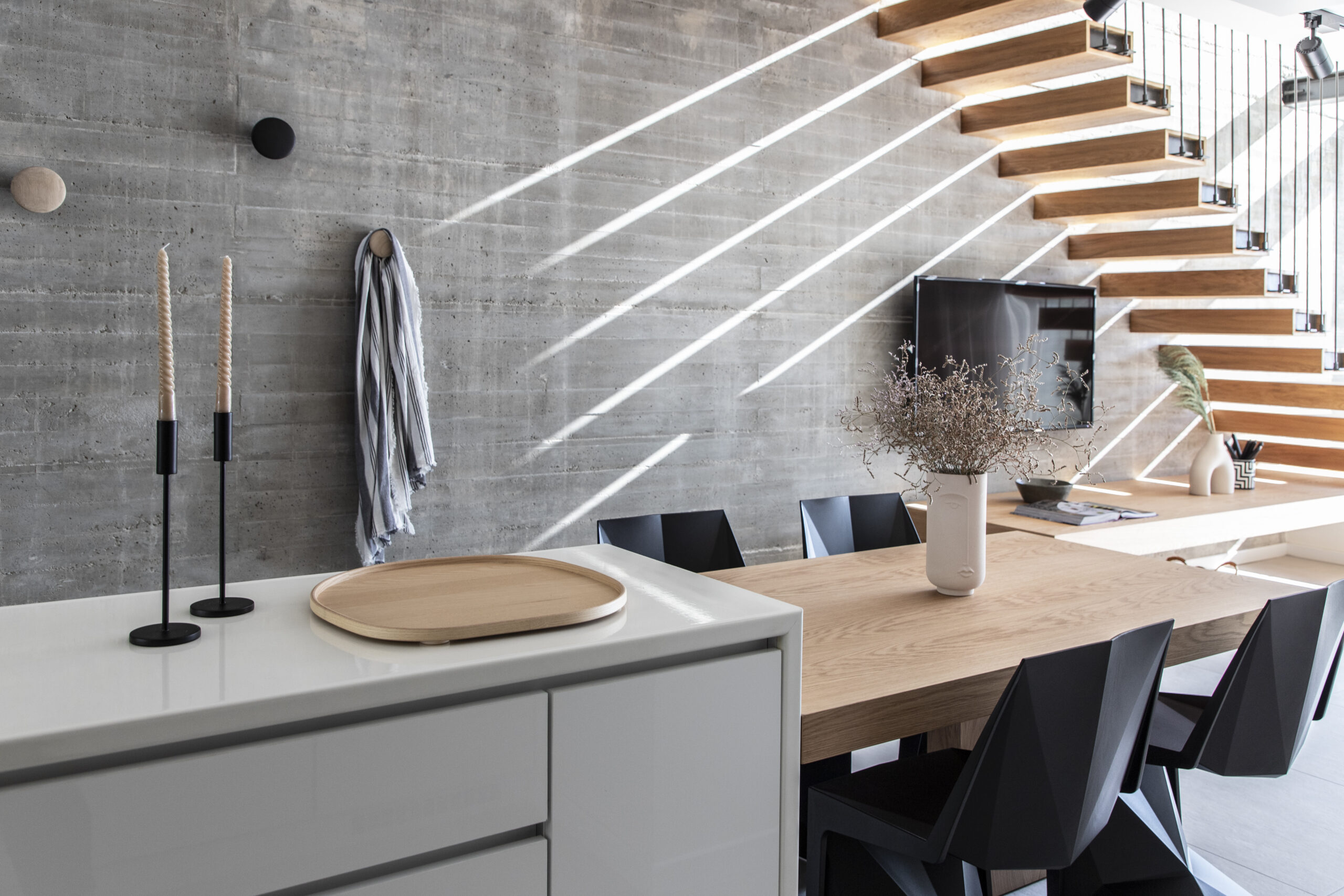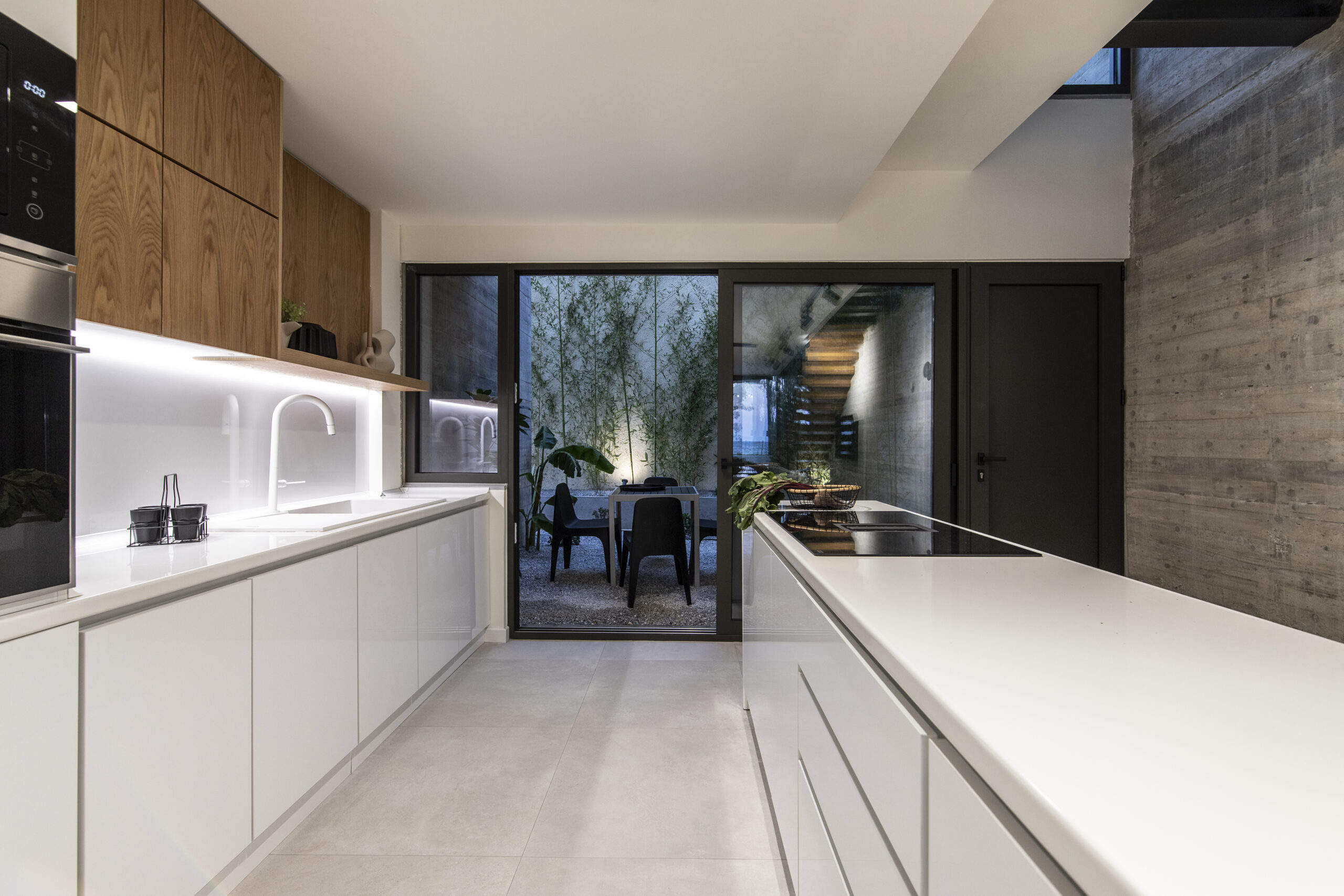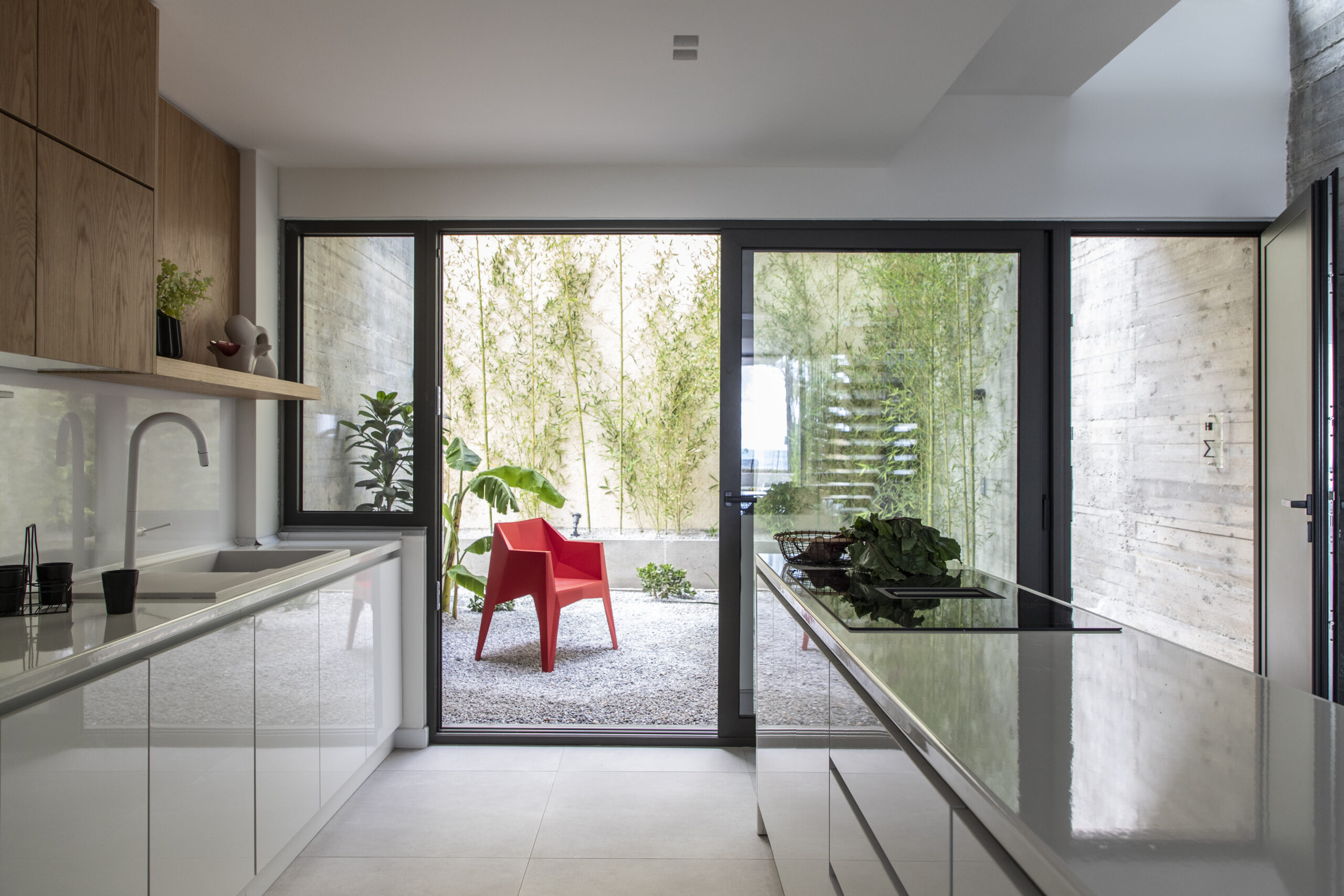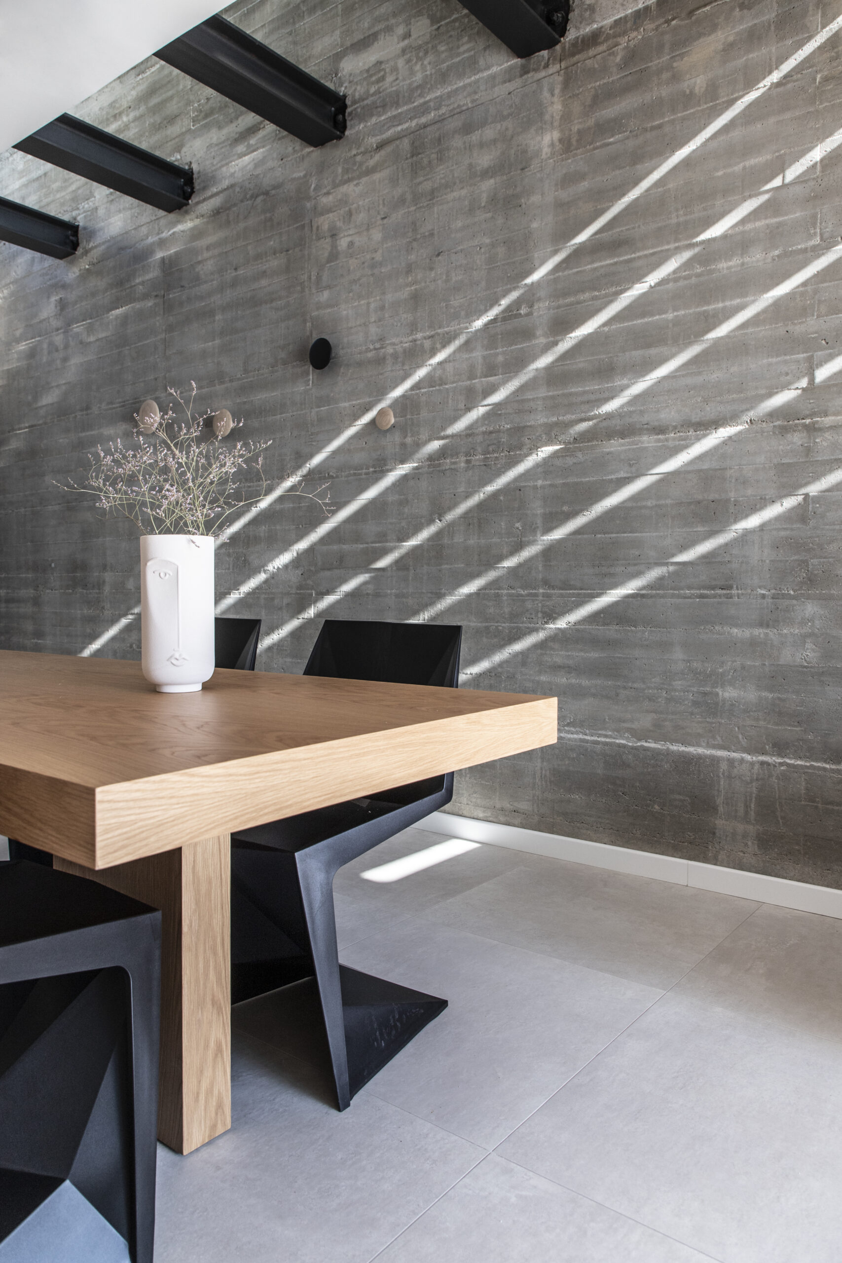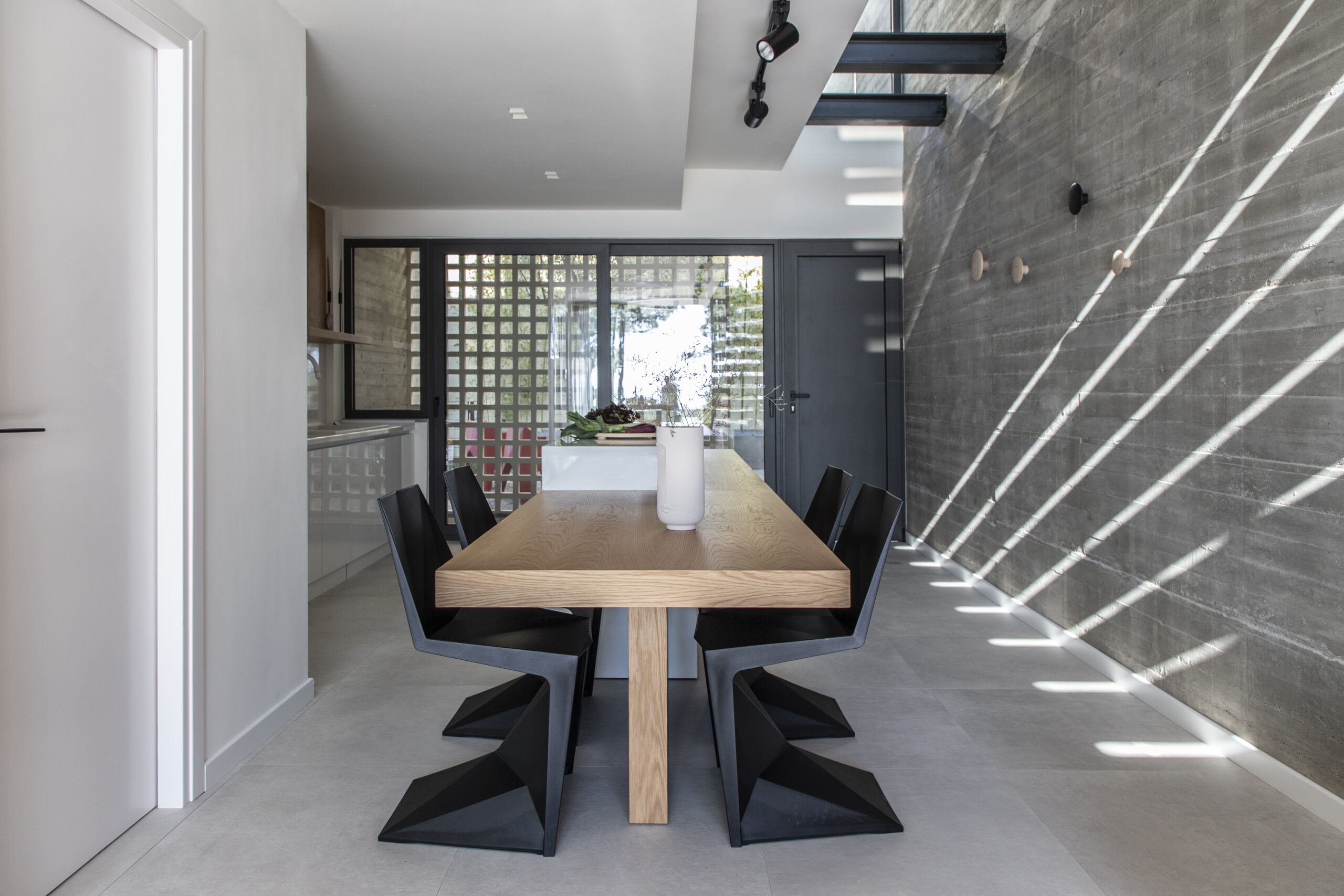 Το καθιστικό οπτικά εκτείνεται και στην μπροστινή βεράντα, καθώς η τζαμαρία που καταλαμβάνει όλο το πλάτος του χώρου αφήνει να χαθούν τα όρια του εσωτερικού χώρου με τον εξωτερικό. Αναρτημένα μεταλλικά σκαλοπάτια με φόντο τον τοίχο από εμφανές σκυρόδεμα οδηγούν στα υπνοδωμάτια του ορόφου.