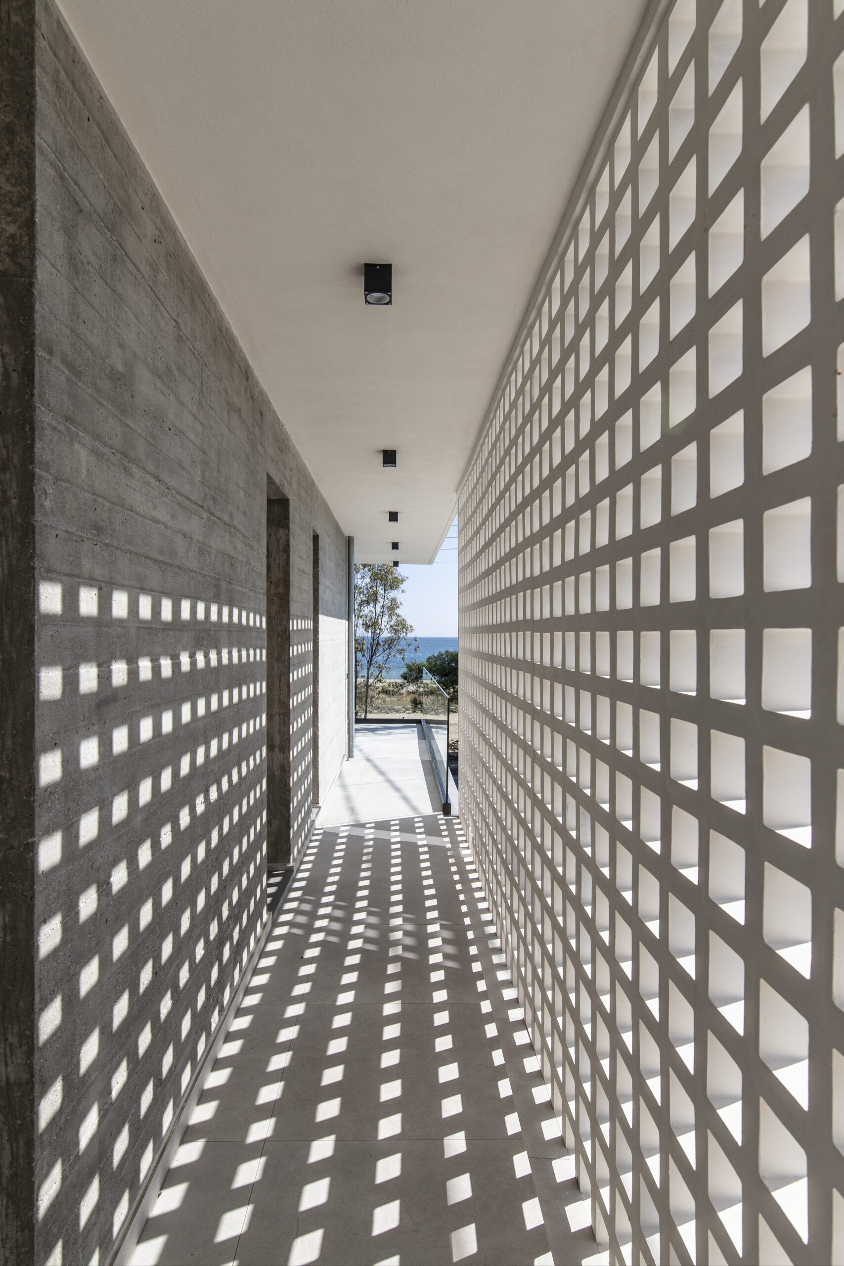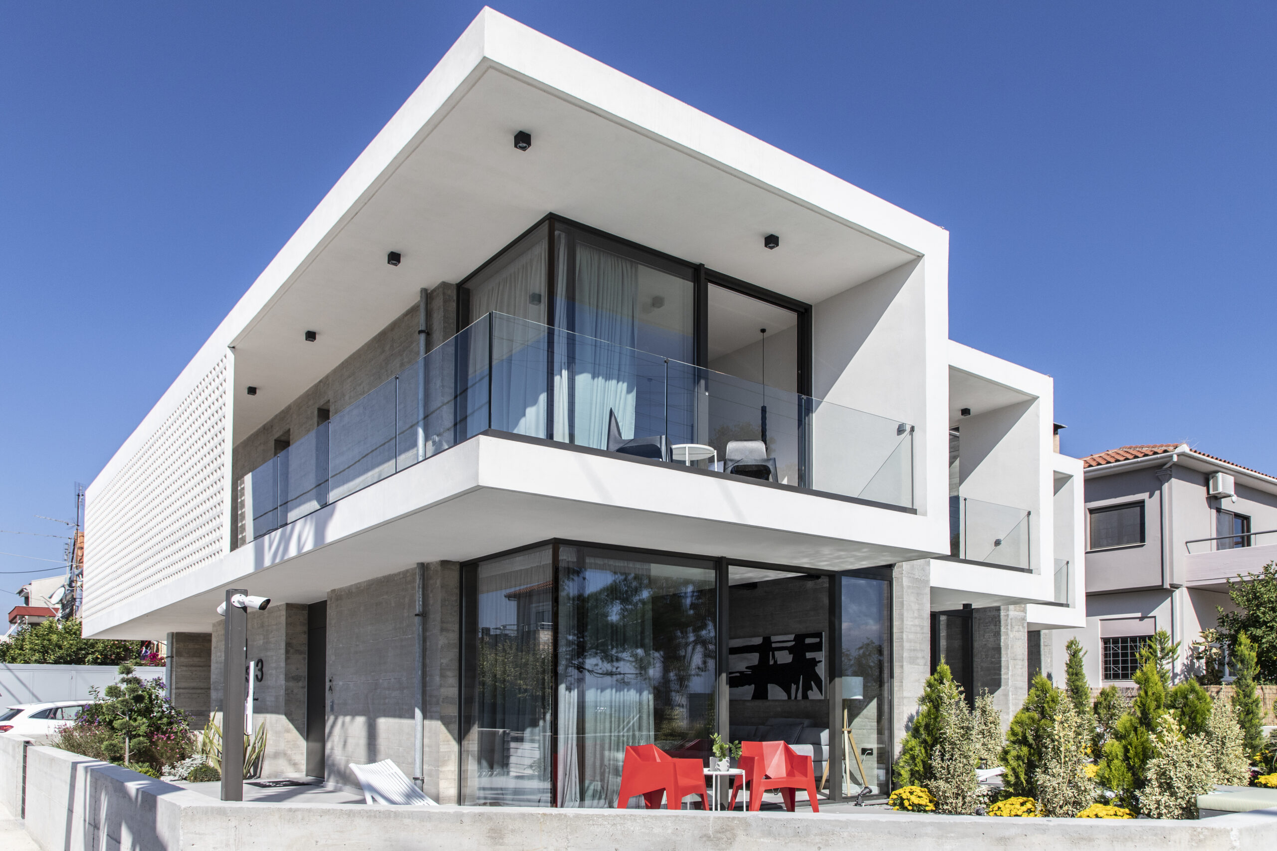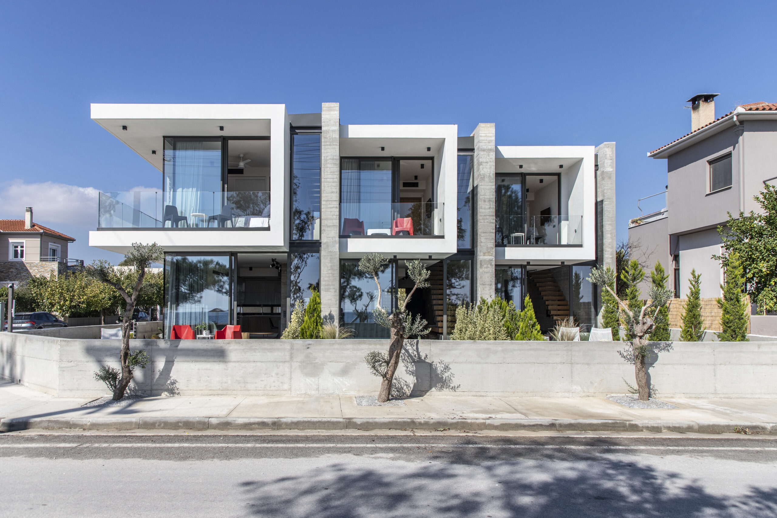 Τα κυρίως υπνοδωμάτια βρίσκονται στην πλευρά της θάλασσας, με τα γυάλινα πετάσματα να εκτείνονται σε όλο το φάρδος του δωματίου. Η βεράντα πλαισιώνεται από τοίχους, διαφυλάσσοντας την ιδιωτικότητα των ενοίκων, δημιουργώντας παράλληλα μια ογκοπλαστική έξαρση στην όψη, η οποία επαναλαμβάνεται και για τις τρεις κατοικίες ως λευκός κύβος σε πρόβολο σε απόσταση από τον τοίχο με εμφανές σκυρόδεμα. Στην γωνιακή κατοικία η βεράντα διαφοροποιείται καθώς δημιουργείται μια γραμμική βεράντα σε συνέχεια με την μπροστινή σε όλο το μήκος της κατοικία, ενώ ένας διάτρητος τοίχος από κεραμικά κλωστρά τοποθετημένος στην άκρη του εξώστη κατά μήκος της ανατολικής πλευράς λειτουργεί ως φίλτρο ιδιωτικότητας, τονίζοντας την γραμμικότητα του κτιρίου.