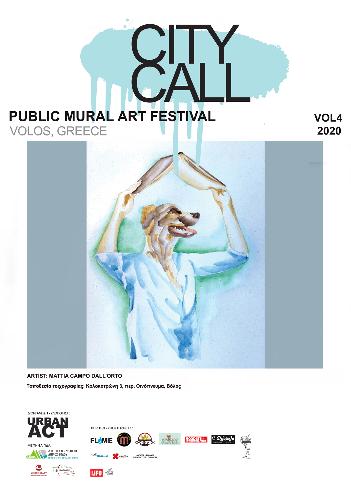 Συμμετέχει ο Ιταλός καλλιτέχνης Mattia Campo Dall’Orto, ο οποίος είχε επισκεφτεί την πόλη και πέρσι και φέτος ολοκληρώνει το δίπτυχο έργο του για τα αδέσποτα ζώα. Η τοιχογραφία υλοποιείται σε επιφάνεια πολυκατοικίας επί της οδού Κολοκοτρώνη 3 στην περιοχή Οινόπνευμα.
